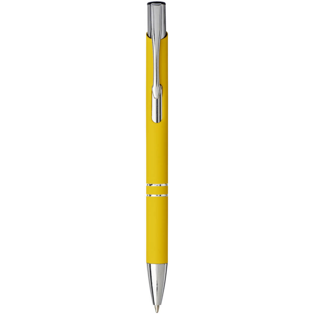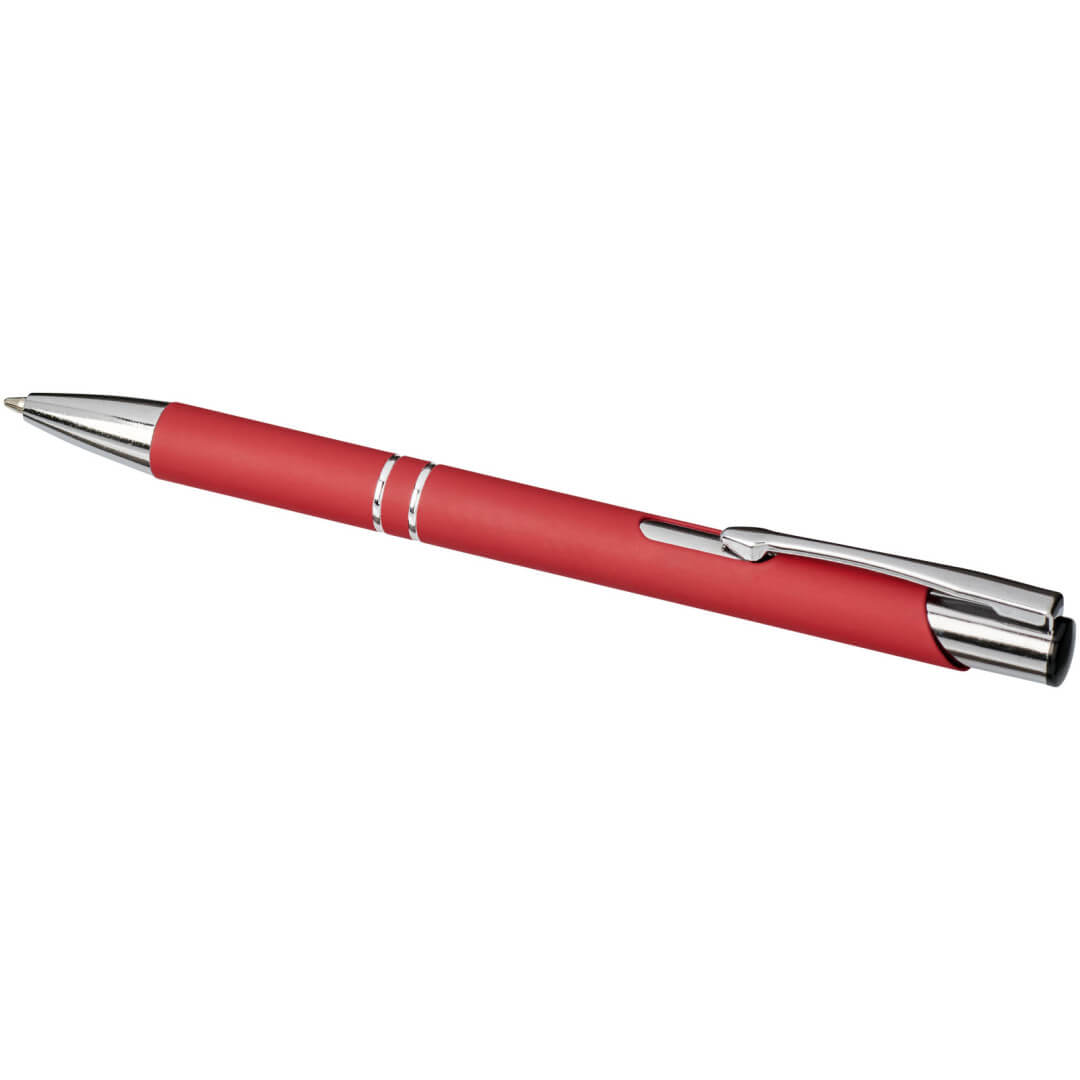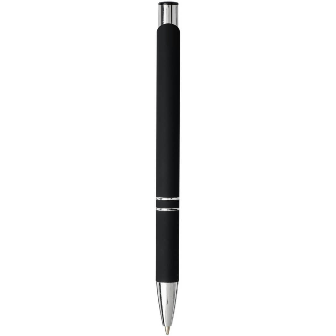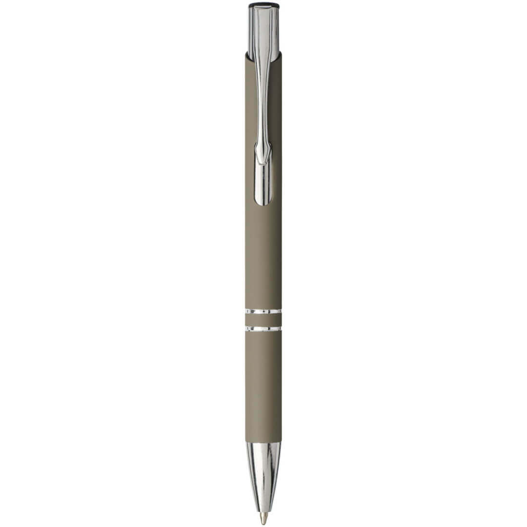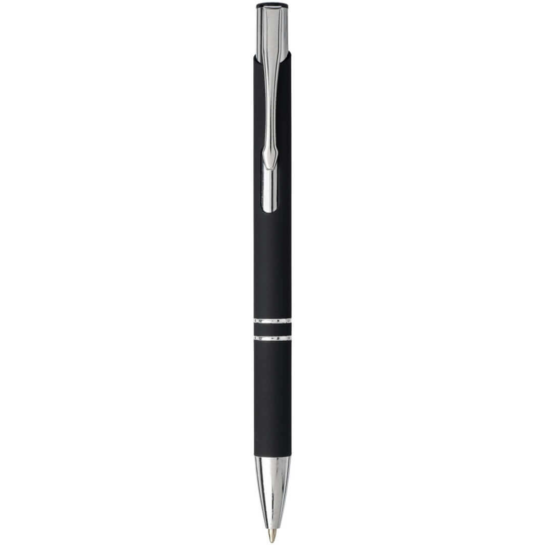 Moneta stláčacie guľôčkové pero s jemným úchopom. Vďaka pogumovanému povrchu má pero mäkký úchop a laserové rytie odhalí striebornú spodnú vrstvu. Guľôčkové pero so stláčacím mechanizmom, povrchom potiahnutým čiernou gumou, detaily z chrómu a hornou časťou z čierneho ABS plastu. Široká a obľúbená rada Moneta je dostupná v rôznych štýloch a prevedeniach. Pogumované hliníkové telo.