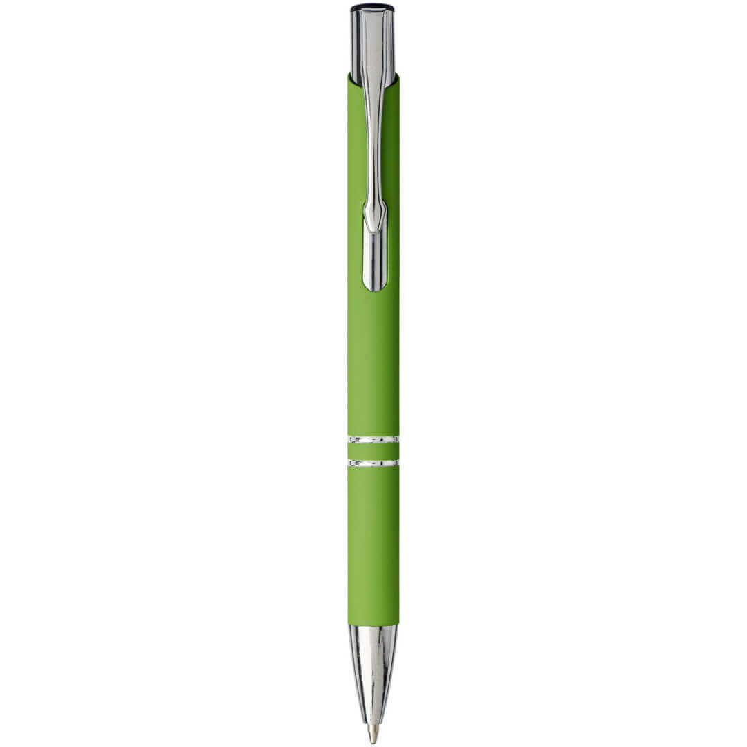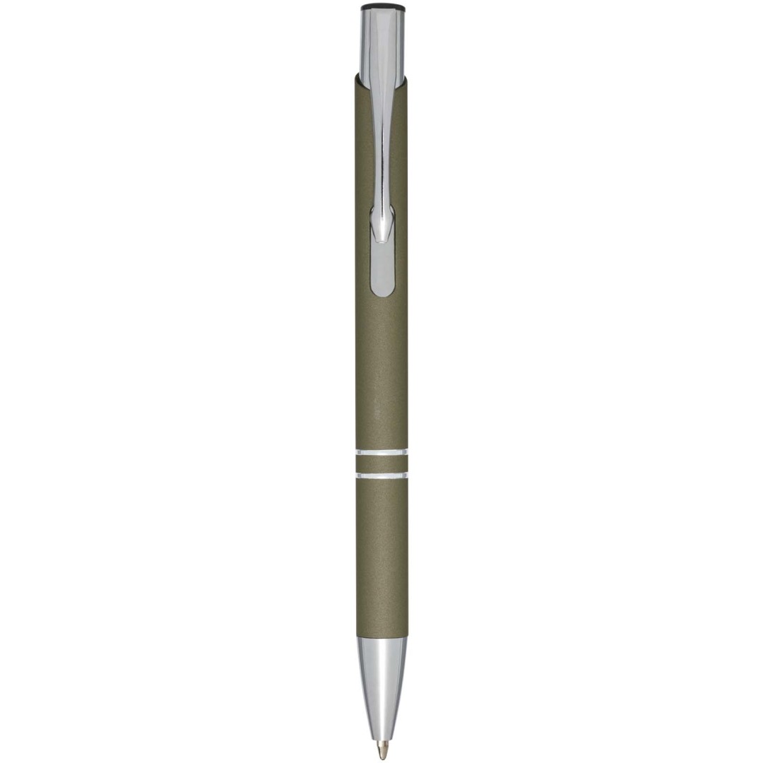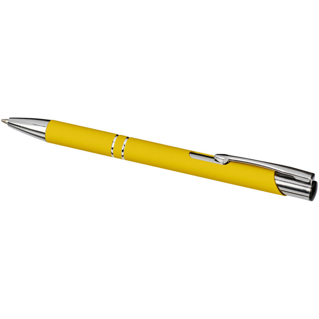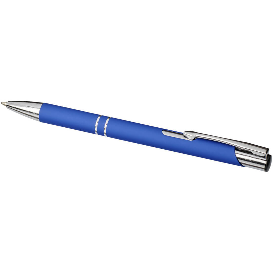 Moneta stláčacie guľôčkové pero s jemným úchopom. Vďaka pogumovanému povrchu má pero mäkký úchop a laserové rytie odhalí striebornú spodnú vrstvu. Guľôčkové pero so stláčacím mechanizmom, povrchom potiahnutým čiernou gumou, detaily z chrómu a hornou časťou z čierneho ABS plastu. Široká a obľúbená rada Moneta je dostupná v rôznych štýloch a prevedeniach. Pogumované hliníkové telo.