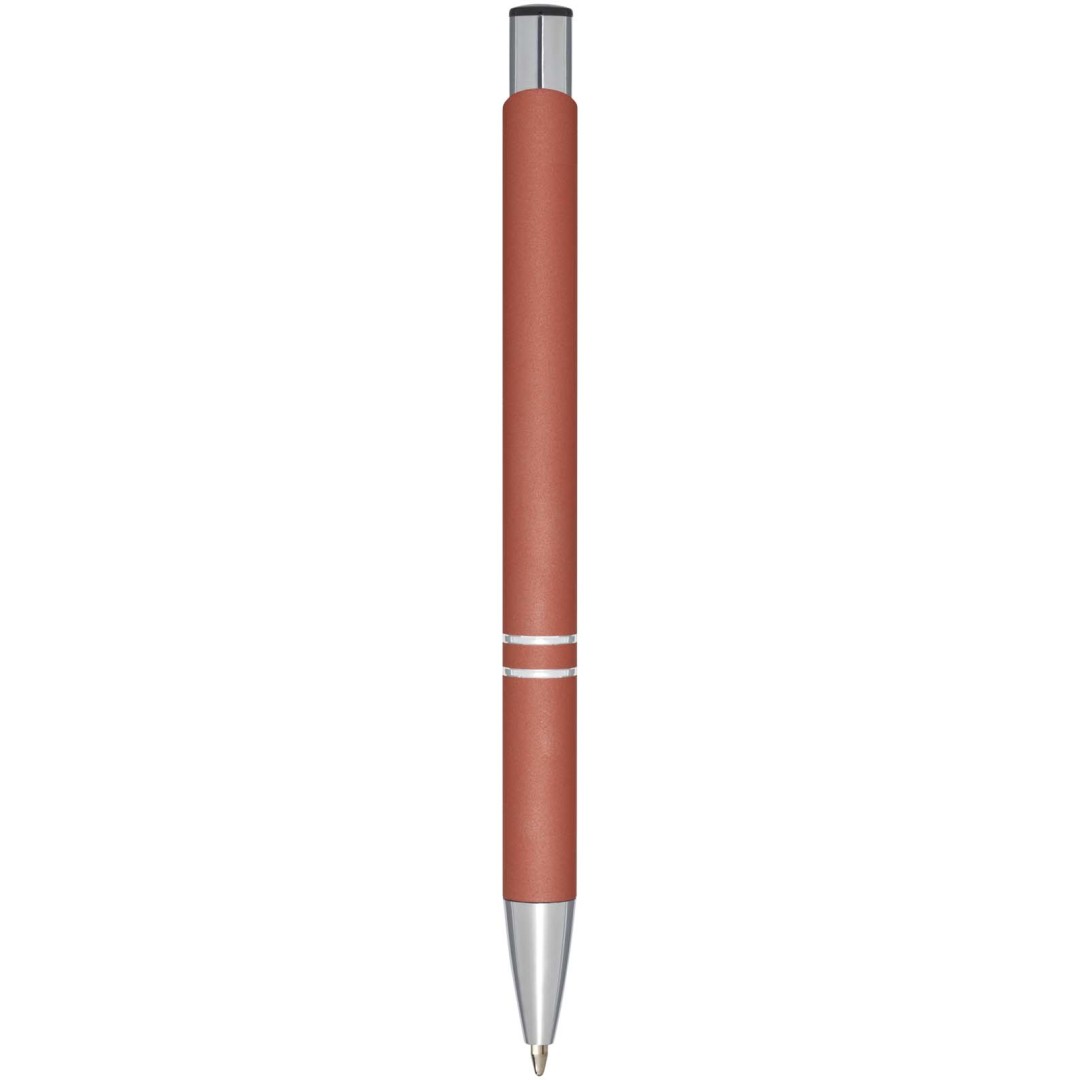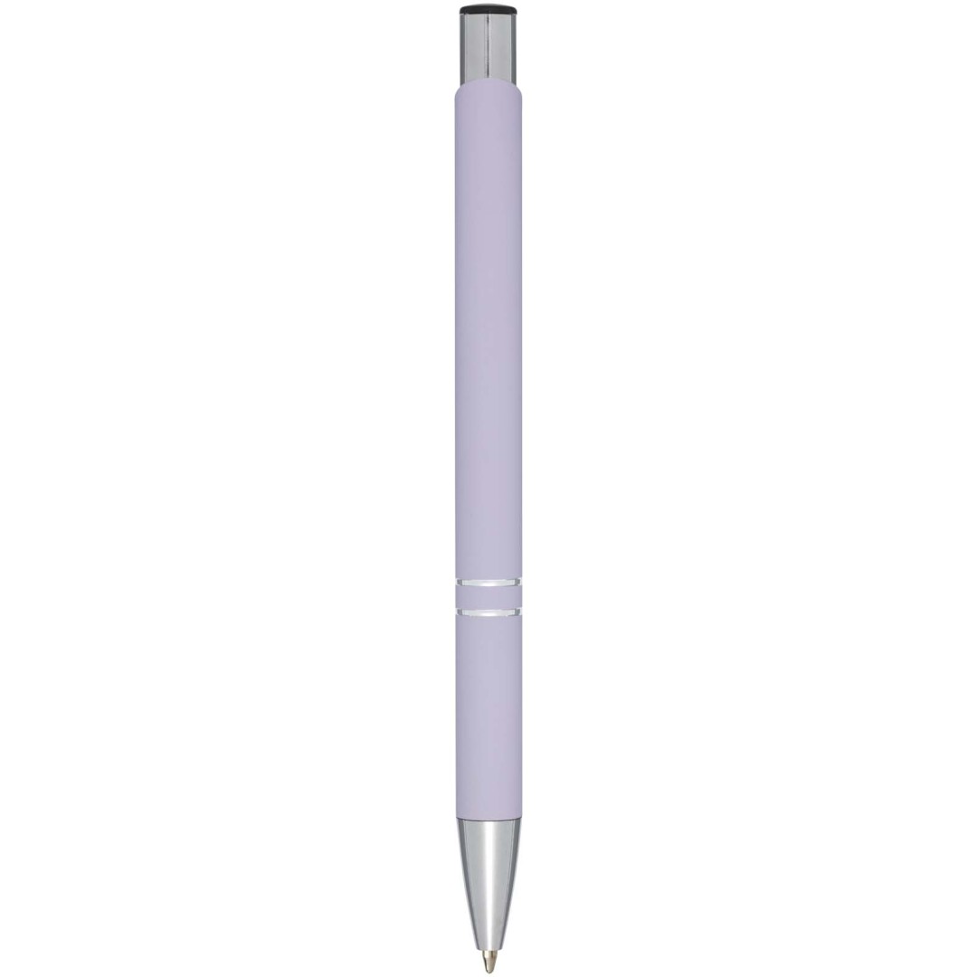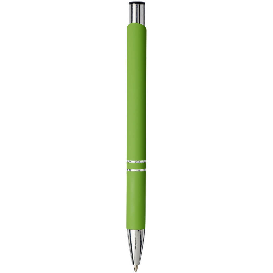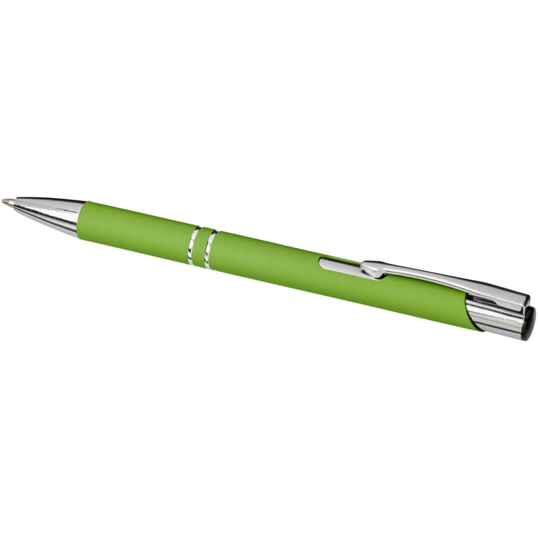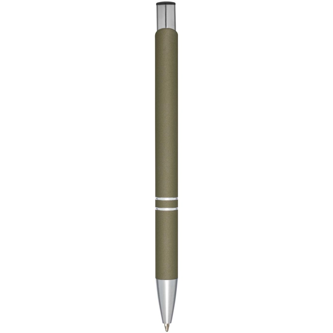 Moneta stláčacie guľôčkové pero s jemným úchopom. Vďaka pogumovanému povrchu má pero mäkký úchop a laserové rytie odhalí striebornú spodnú vrstvu. Guľôčkové pero so stláčacím mechanizmom, povrchom potiahnutým čiernou gumou, detaily z chrómu a hornou časťou z čierneho ABS plastu. Široká a obľúbená rada Moneta je dostupná v rôznych štýloch a prevedeniach. Pogumované hliníkové telo.