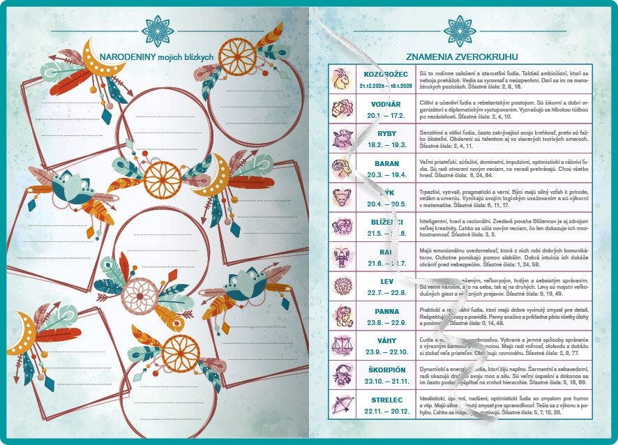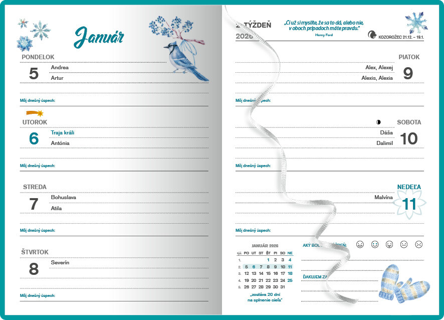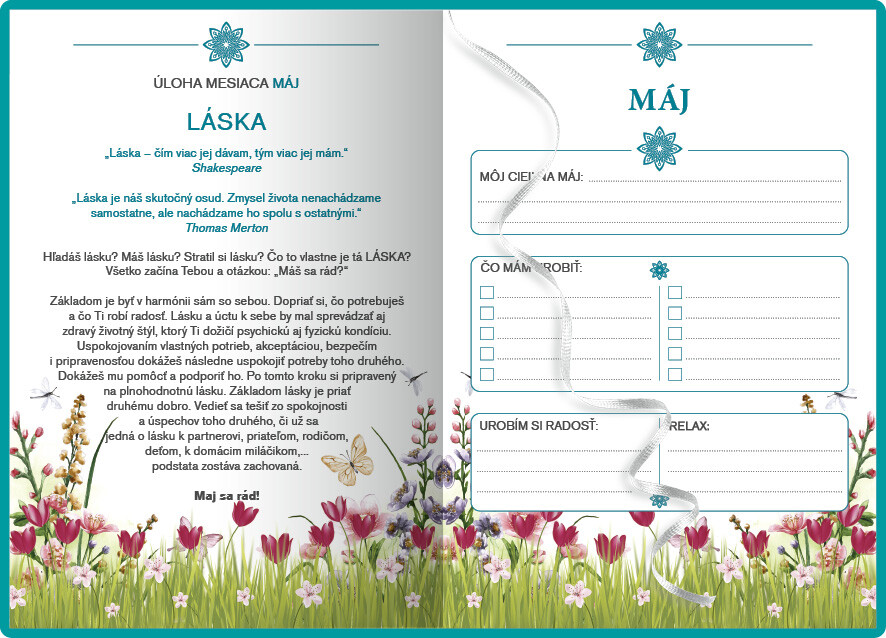 Obľúbený diár s graficky prepracovaným týždenným kalendáriom, Vám spríjemní každý týždeň novým mottom. Každý mesiac nájdete súhrn svojich cieľov či myšlienok, ku ktorým Vás nabudia motivačné texty na začiatku každého mesiaca. Počas voľných chvíľ si môžete vymaľovať tematické antistresové omaľovánky. Obal diára je v tvrdých doskách so soft touch laminom, efektnej razby a 3D laku. Vhodný ako darček.