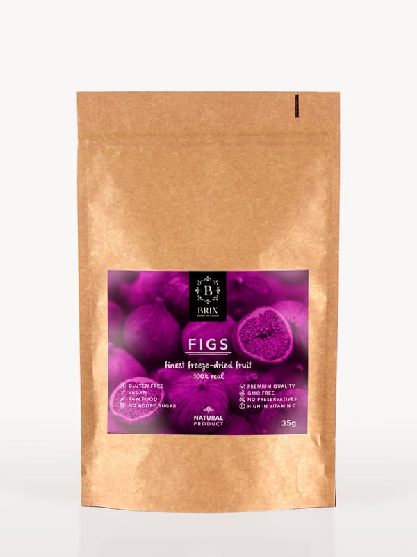 Mrazom sušená figa je 100% čisté ovocie, ktoré si zachováva svoju farbu, chuť a až 98 % výživových hodnôt. Chrumkavé kúsky sú ideálne do jogurtov, müsli, smoothies, na pečenie či priamu konzumáciu. Figy sú pestované na úrodnej pôde a zbierané v čase ideálnej zrelosti, čo zaručuje výnimočnú chuť a arómu. Na výrobu 35 g je použitých 350 g čerstvých fíg.