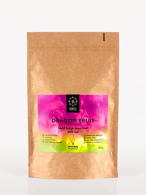 Mrazom sušená pitahaya – dračie ovocie je 100 % čisté ovocie bez konzervantov, ktoré si zachováva krásnu farbu, intenzívnu chuť a až 98 % výživových hodnôt. Pestovaná na úrodnej pôde v panenskej prírode, dozrieva pod slnkom a zbiera sa v čase ideálnej zrelosti. Chrumkavé kúsky sú ideálne do müsli, jogurtov, smoothies, na pečenie či ako zdravý snack. Každých 100 g je vyrobených z 800–1000 g čerstvého ovocia.