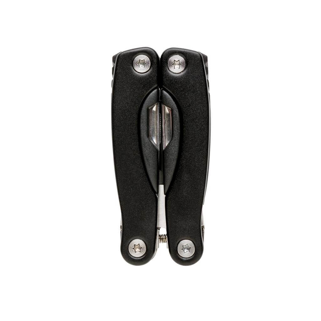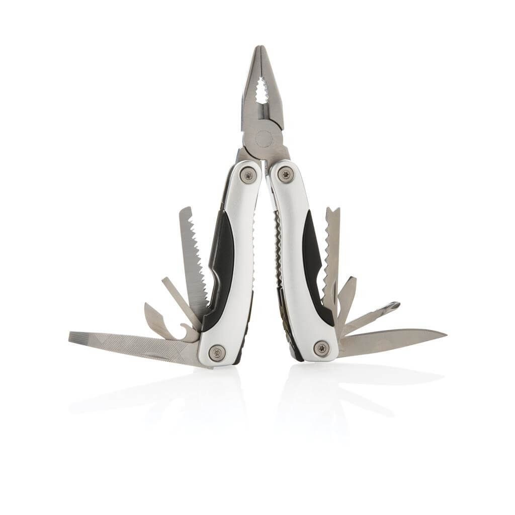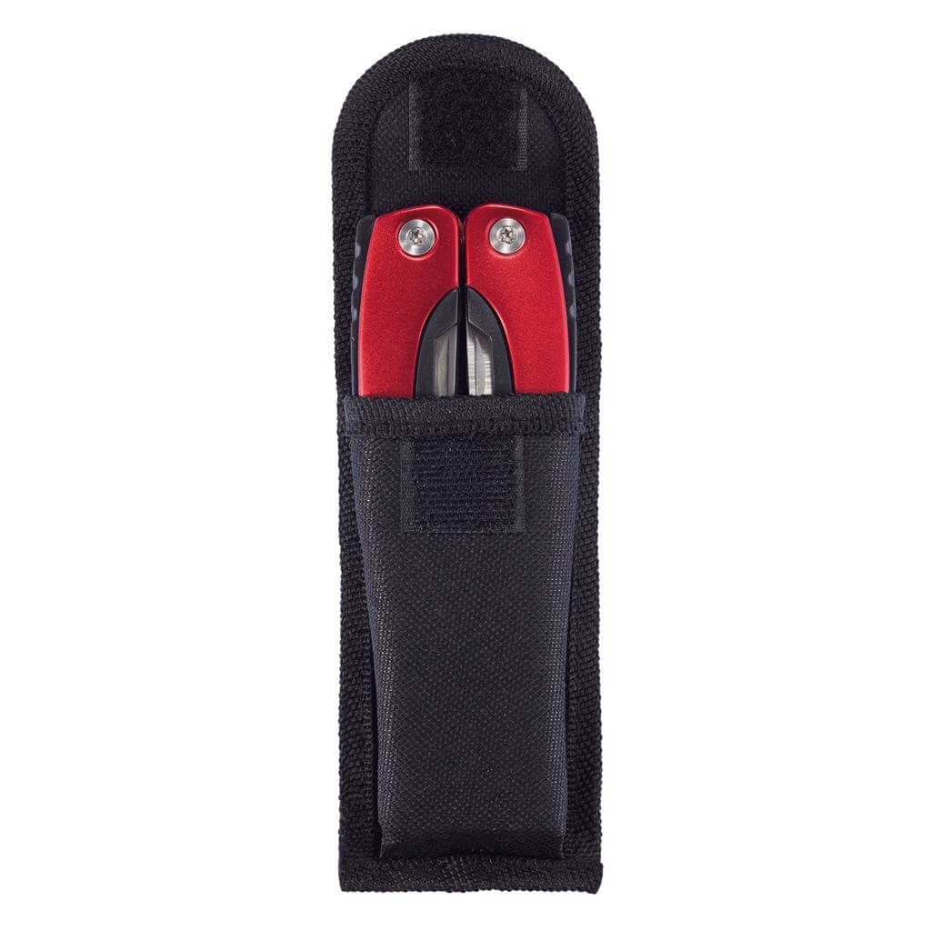 Hliníkový multifunkčný nástroj, rukoväť s čiernými detailamy, 14 funkcií, uložený v čiernom puzdre 600D.