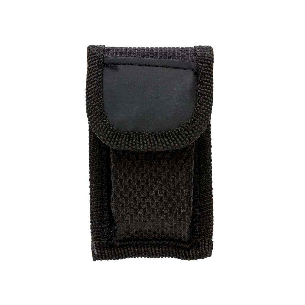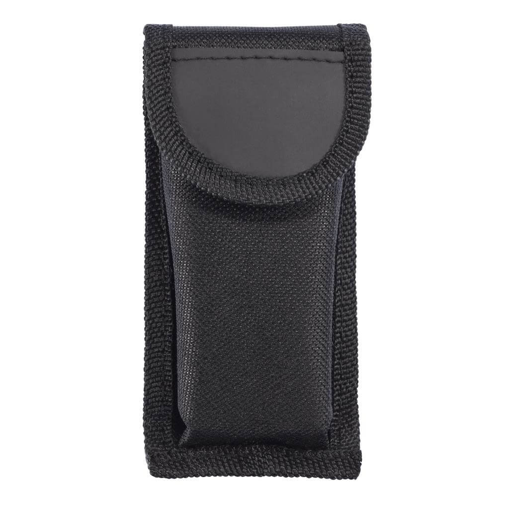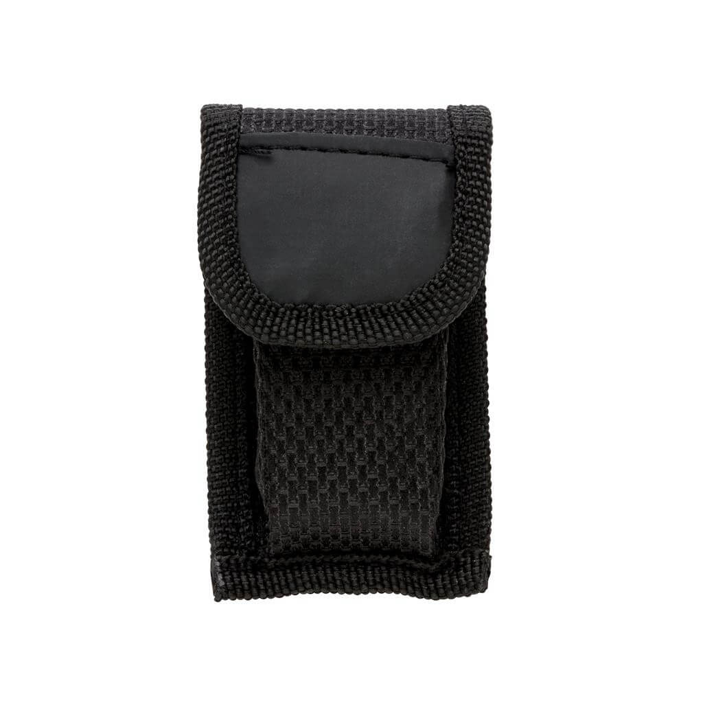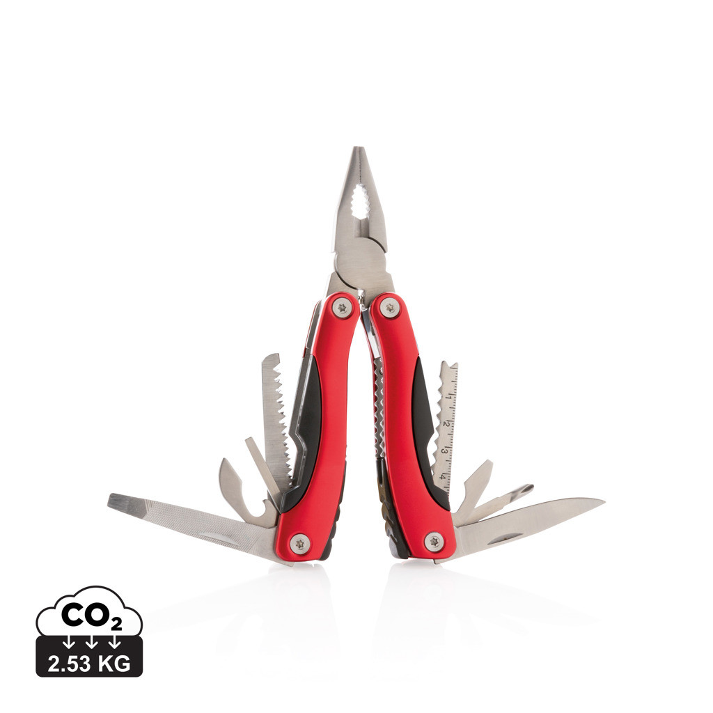 Hliníkový multifunkčný nástroj, rukoväť s čiernými detailamy, 14 funkcií, uložený v čiernom puzdre 600D.
