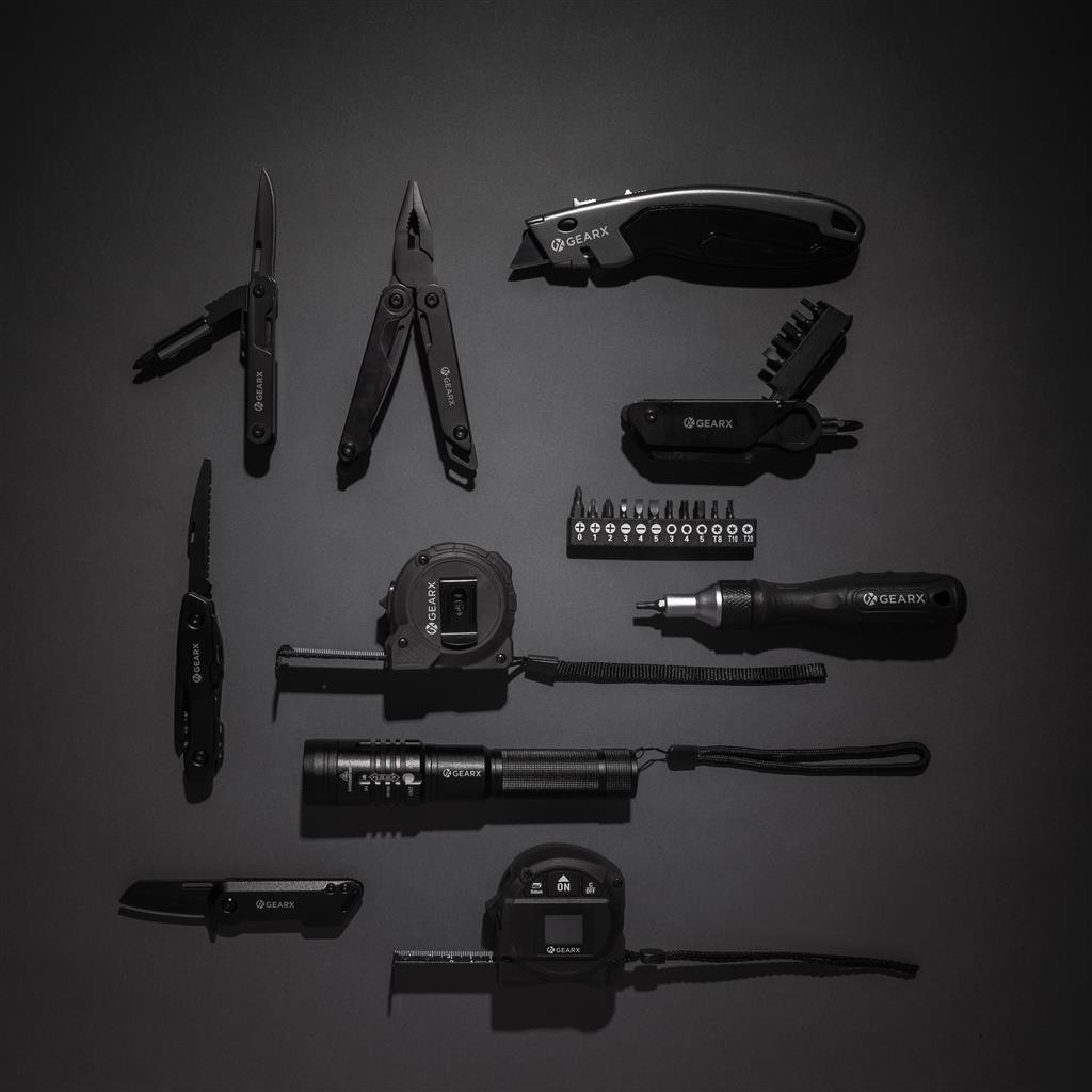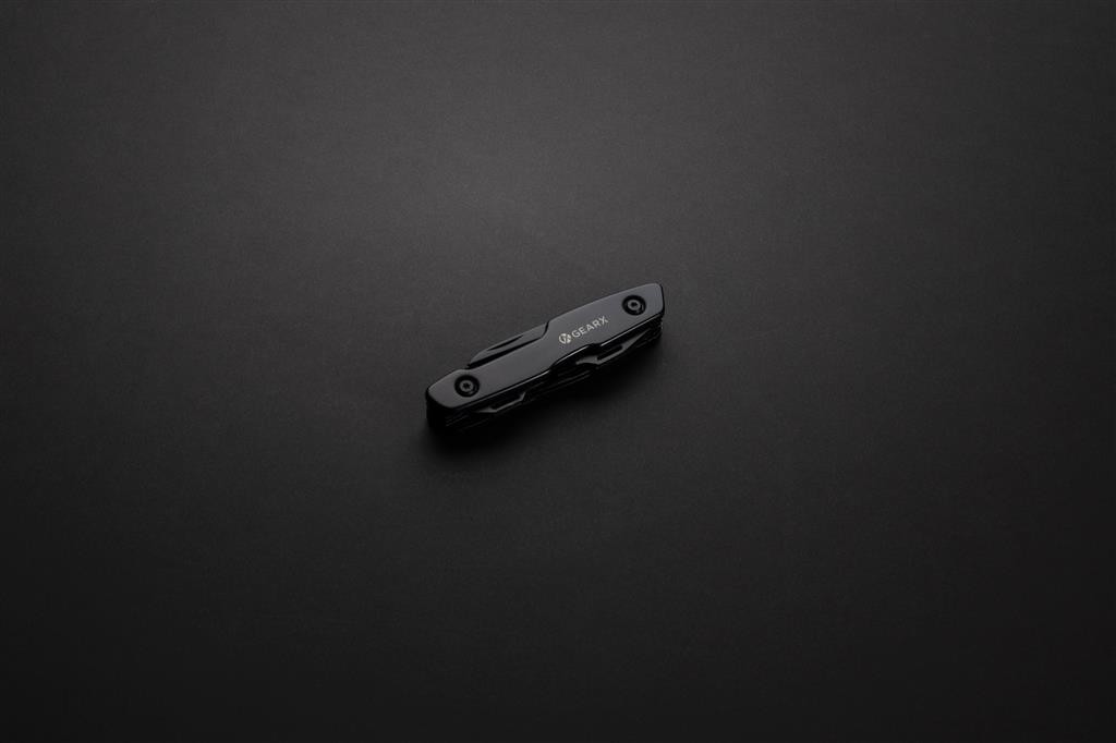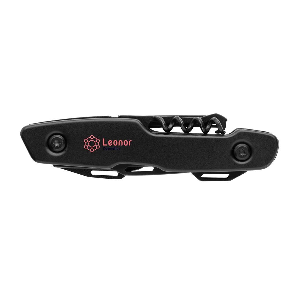 Čistý čierny design v kombinácii s vysokou kvalitou a funkčnosťou. Telo vyrobené z luxusného hliníka, nástroja a čepeľ z prémiovej 420 nehrdzavejúcej ocele. Všetko v čiernom odtieni. Disponuje celkom 13 funkciami: nôž, malý nôž, pílka, pilník, plochý skrutkovač, štandardný a malý krížový skrutkovač, otvárač fliaš a plechoviek, vývrtka, nástroj na šitie, dierovač kože, nôž na balíky. Balené v luxusnej darčekovej krabičke.