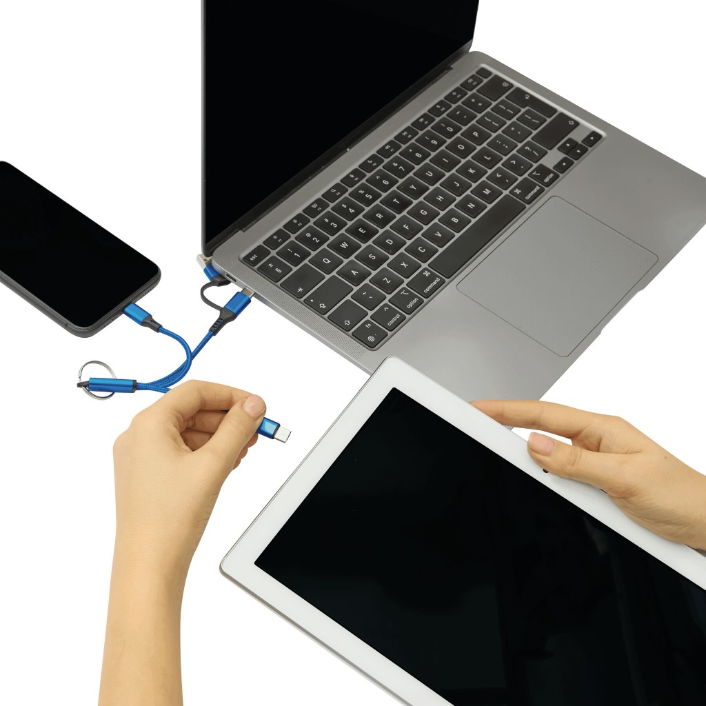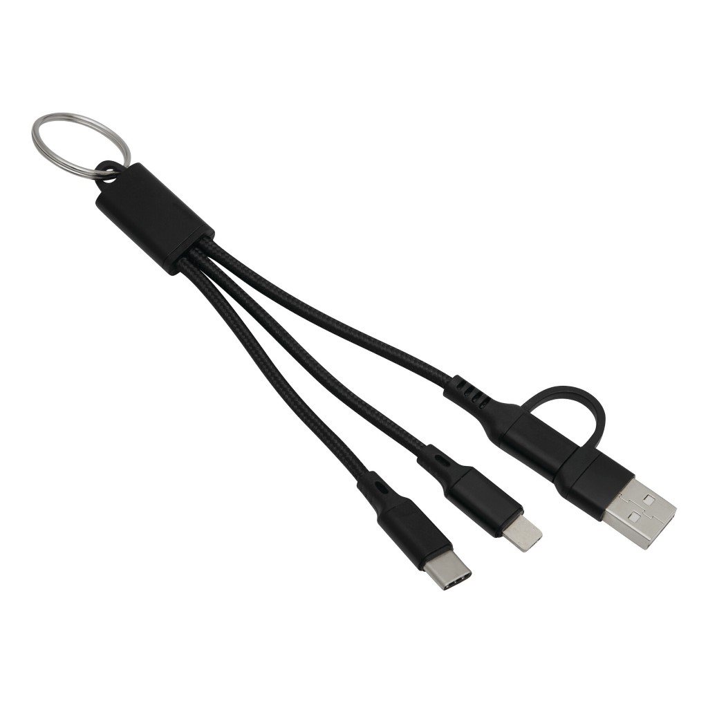 Nabíjací kábel FANTAIL: na nabíjanie elektronických zariadení, dĺžka cca 18 cm, s krúžkom na kľúče, vrátane 2 nabíjacích zástrčiek: USB Type-C a kombinovaný konektor Micro-USB/Lightning, vstupný konektor USB Type-C, adaptér pre USB Type-A