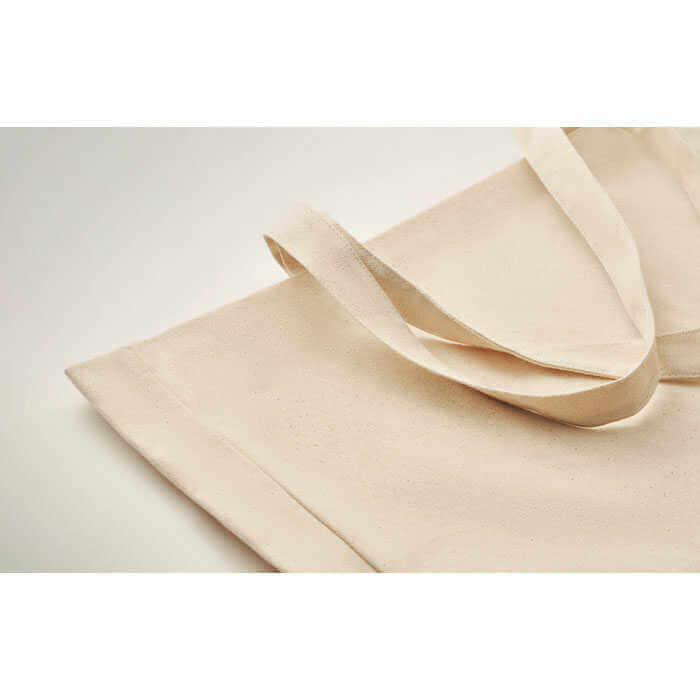 Nákupná alebo plážová taška z recyklovaného plátna s hmotnosťou 280 gr/m². Táto taška má dlhé uši, takže ju môžete nosiť v ruke alebo cez rameno a mať tak voľné ruky. Vďaka klinovitému dnu je veľmi užitočná na prenášanie veľkého množstva vecí na pláž alebo pri nákupovaní. Taška je vyrobená z 50% z bavlny a z 50% z recyklovanej bavlny.