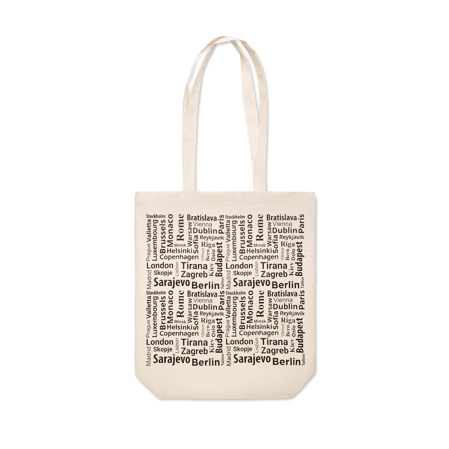 Taška z recyklovanej predspotrebiteľskej bavlny s 10 cm dnom a dlhými rúčkami. Základná prírodná farba. Rozmery tašky: 38x10x42cm; rúčky 70x2cm. Predspotrebiteľská recyklovaná bavlna pochádza z odpadu, ktorý vzniká vo výrobnom procese bavlnených odevov a tašiek. Upozorňujeme, že nie je možné kombinovať sieťotlač a digitálne vytlačené vzory.