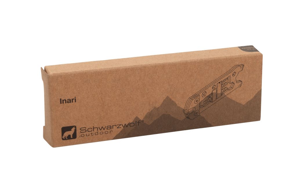Multifunkčné náradie pre cyklistov značky Schwarzwolf. Obsahuje 7 druhov nástrojov v rôznych veľkostiach - centrklíč, plochý skrutkovač, krížový skrutkovač, imbus 4/5/6mm, plochý šesťhranný kľúč v šiestich veľkostiach od 3.3 až 18 mm, otvárač fliaš a pravítko. Balené v darčekovej krabičke. Materiál: nerezová oceľ 2Cr13. Odporúčaná technológia tlače: laser L1. Maximálna veľkosť tlače: 12 × 5 mm. Rozmery: 11,5 × 3,8 × 1,1 cm. Uhlíková stopa: gCO2 e1396.