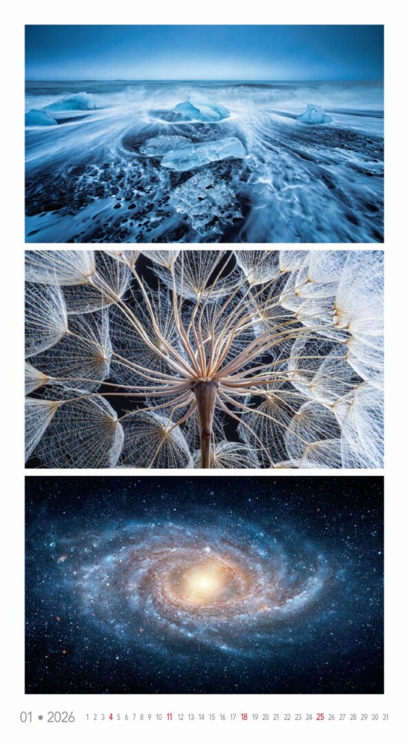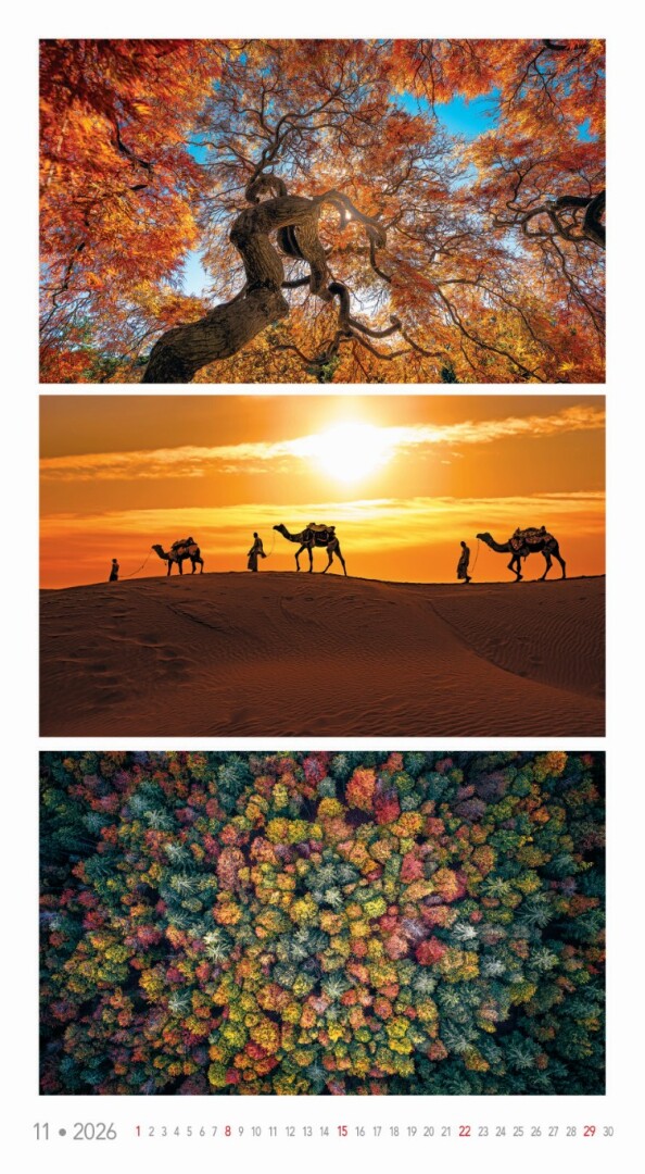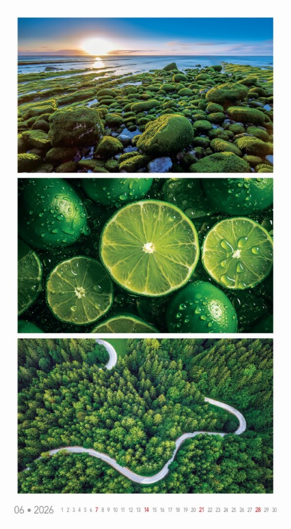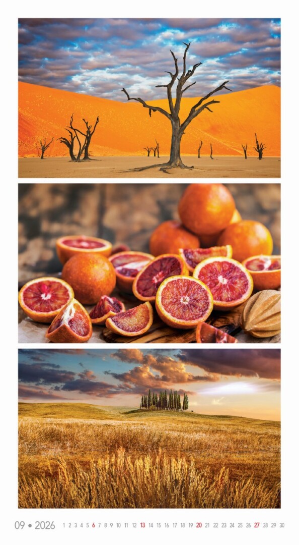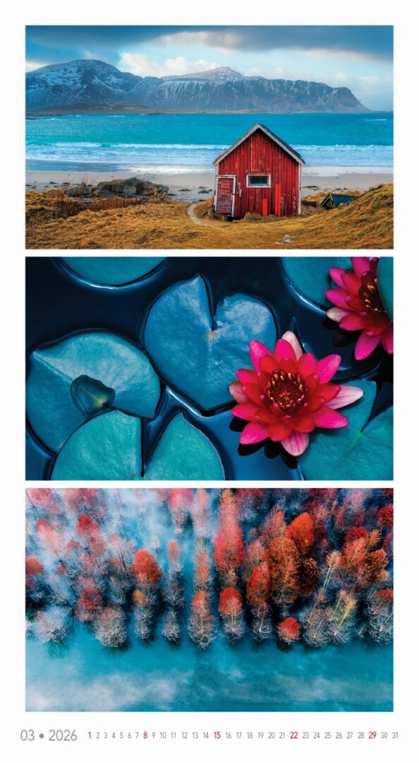 Kalendár, ktorý oslavuje rozmanitosť prírody v jej najfarebnejších podobách. Každý mesiac prináša očarujúce fotografie zachytávajúce žiarivé scenérie – od kvetinových polí a jesenných lesov až po exotické krajiny a fialové levanduľové lány. Ideálny pre tých, ktorí milujú prírodu a jej farebný svet.