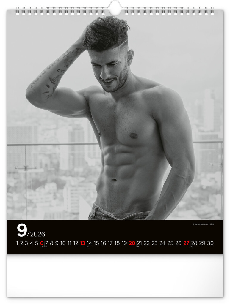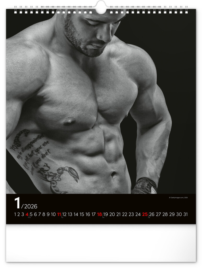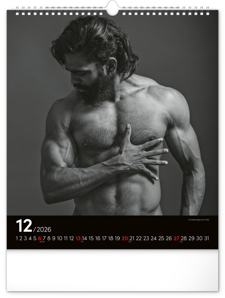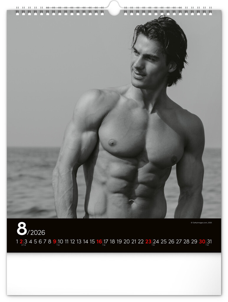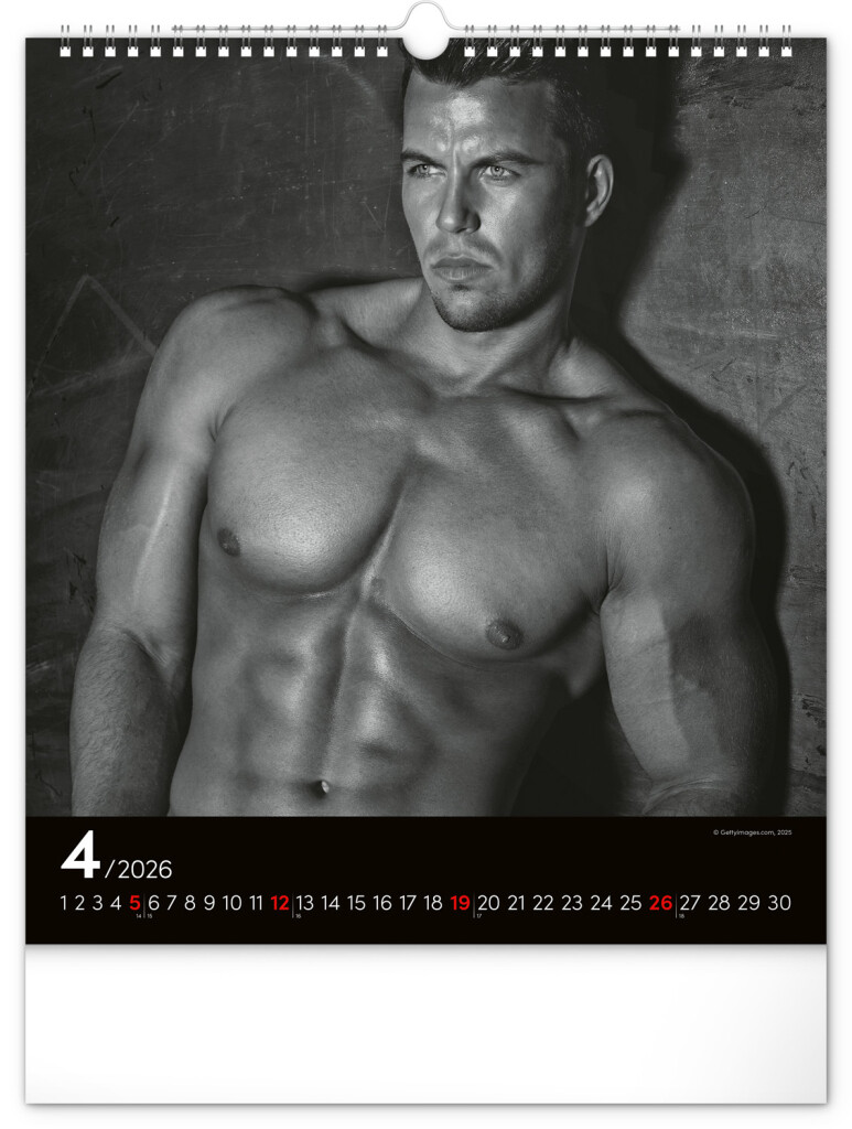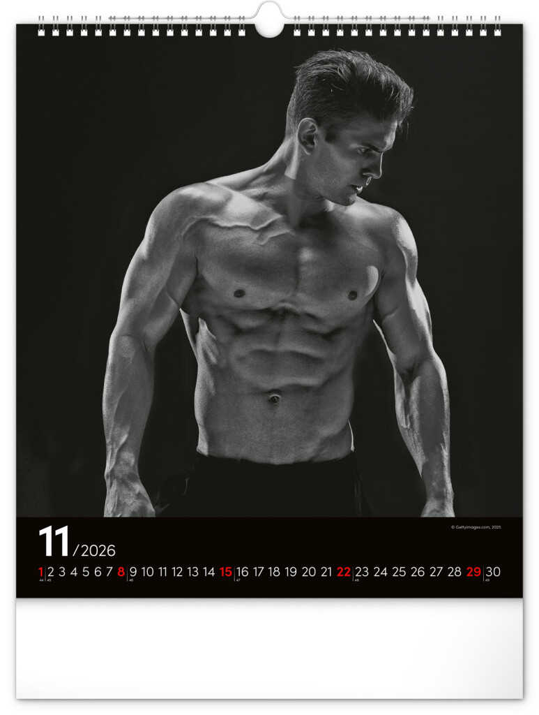 Celý rok sa môžete kochať pohľadom na vyrysované telá príťažlivých mužov na čiernobielych fotografiách. Nechýba jednoduché kalendárium na čiernom pozadí.