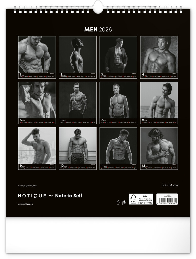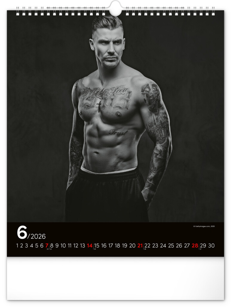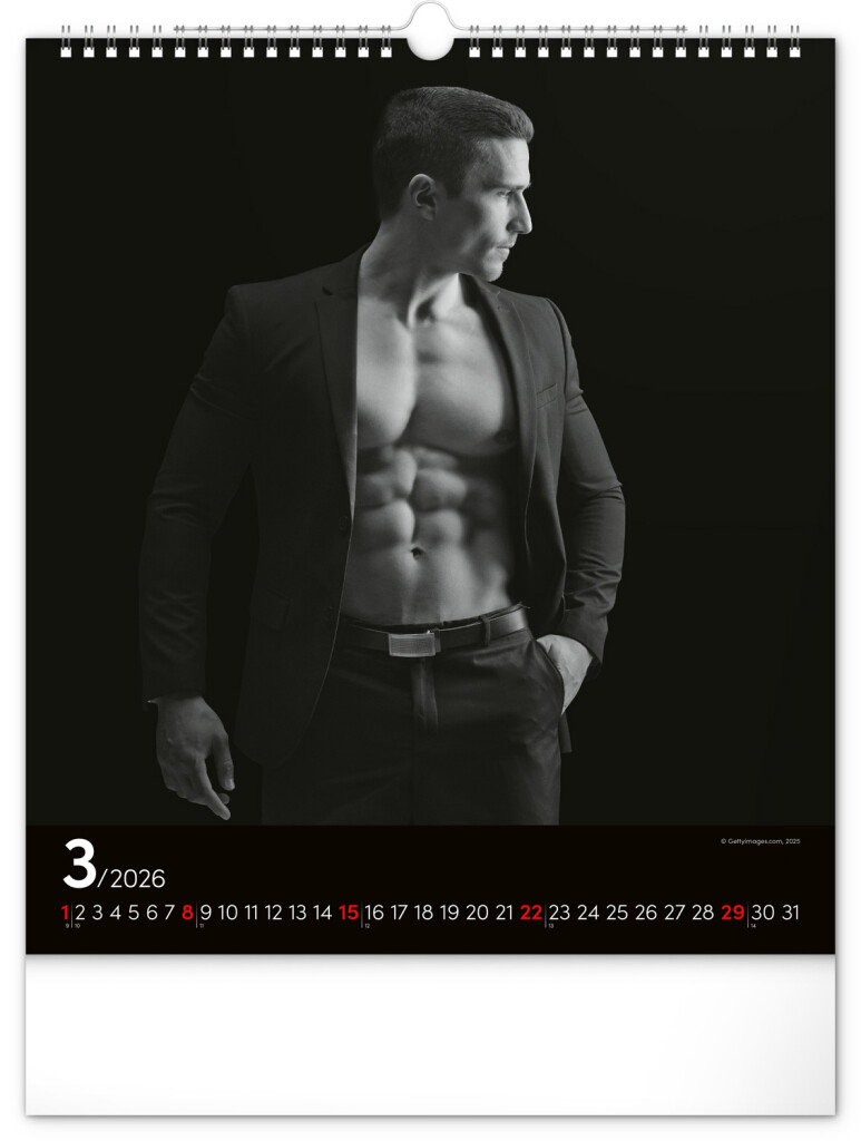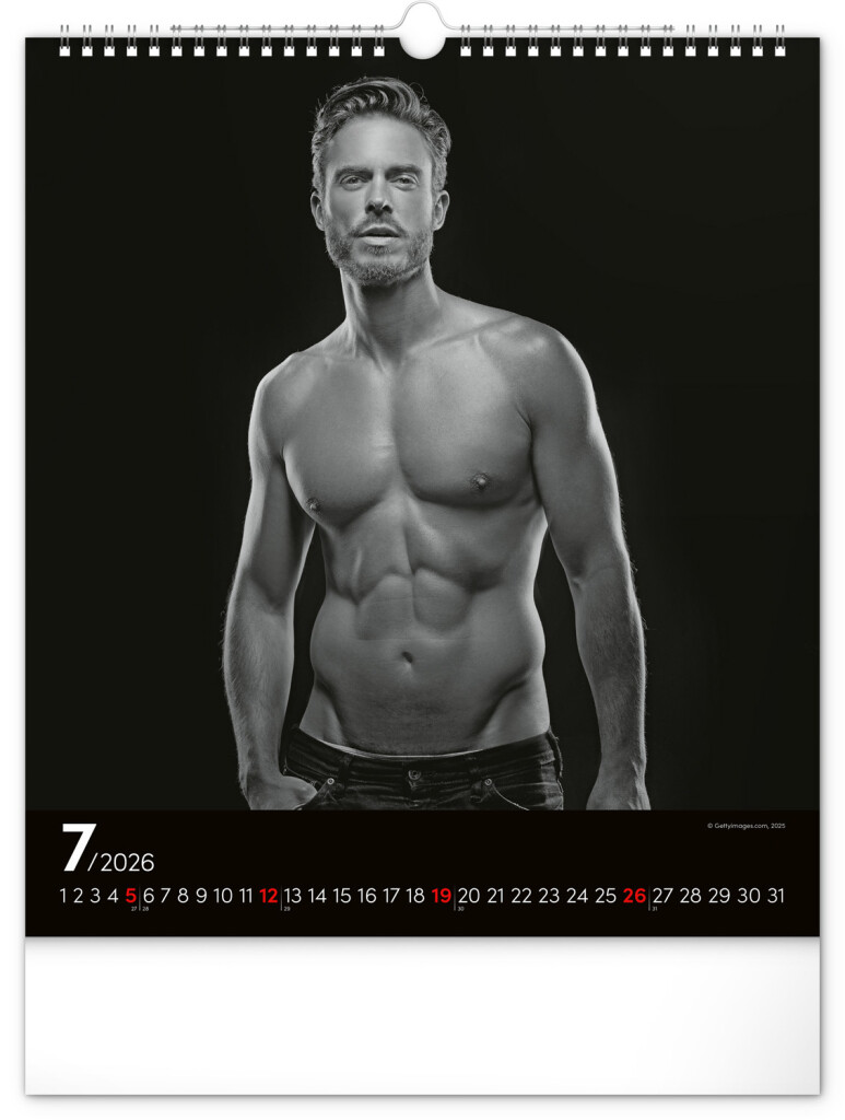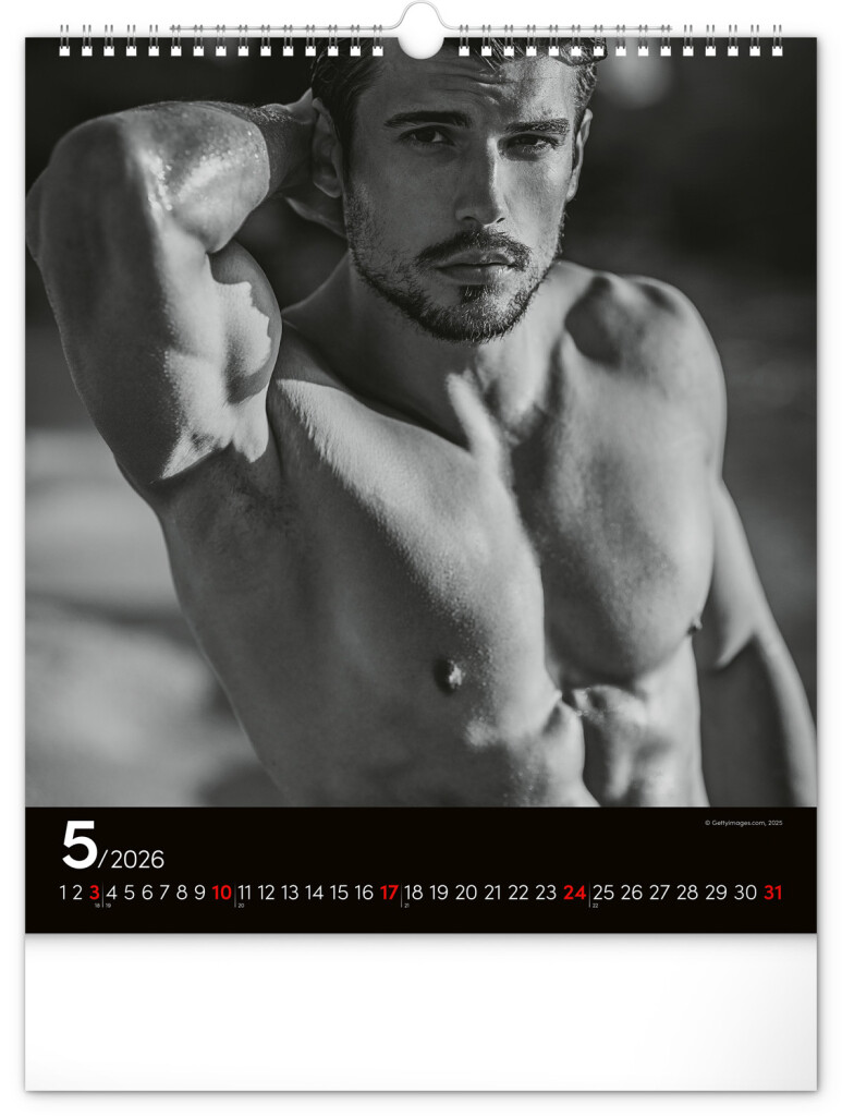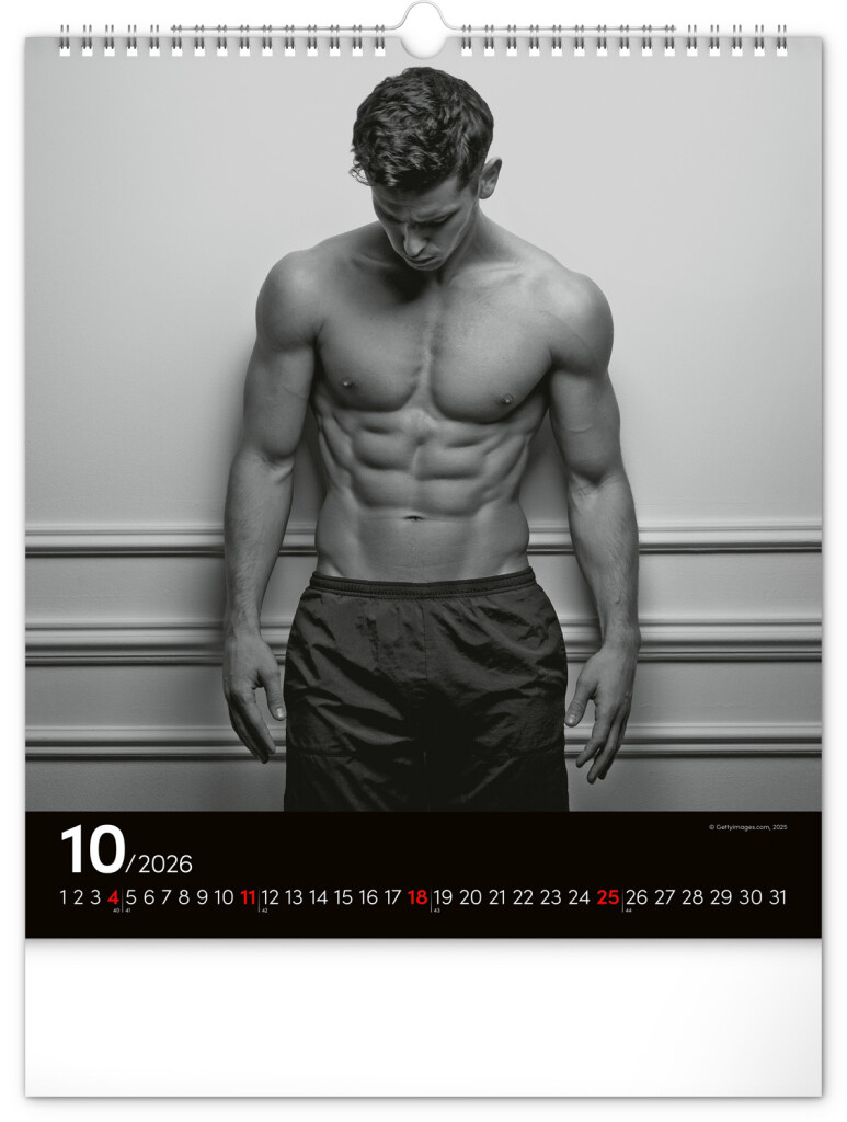 Celý rok sa môžete kochať pohľadom na vyrysované telá príťažlivých mužov na čiernobielych fotografiách. Nechýba jednoduché kalendárium na čiernom pozadí.