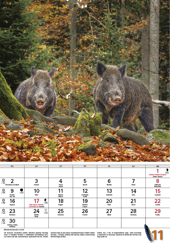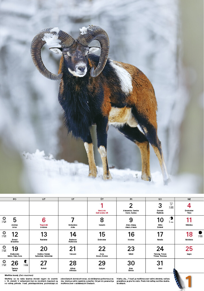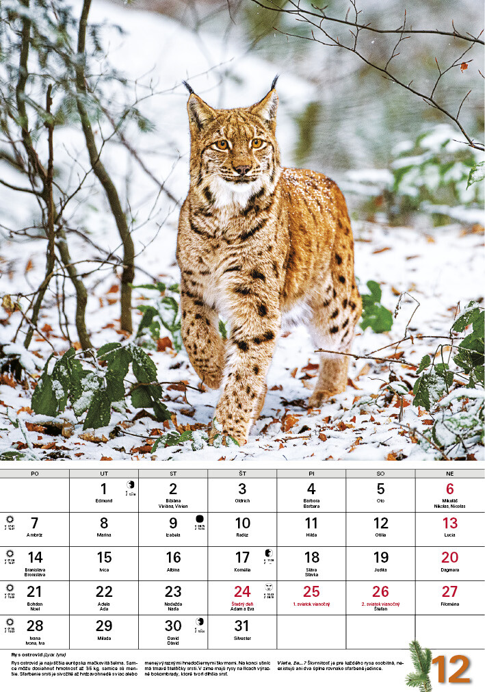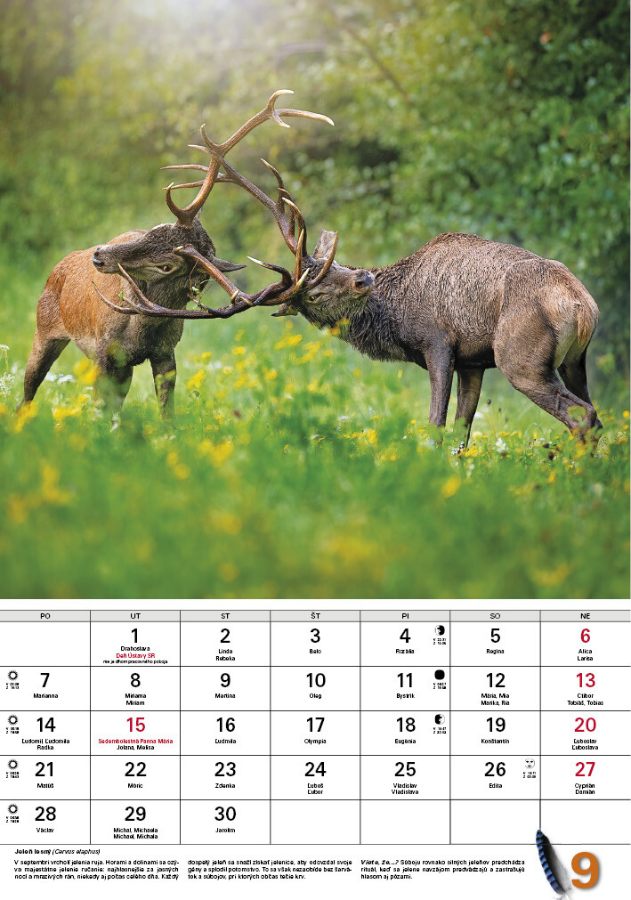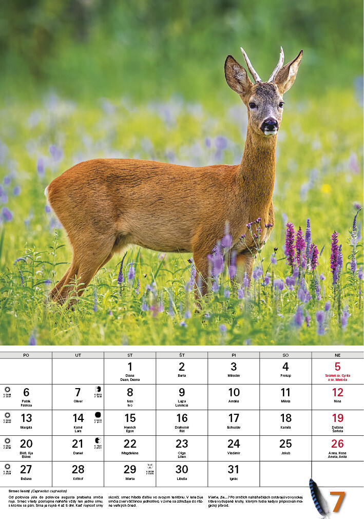 Kalendár pre všetkých milovníkov prírody, lesa a poľovníckej tradície. Každý mesiac prináša nádherné fotografie lesnej zveri v jej prirodzenom prostredí – srnce, jelene, diviaky, bažanty a iné typické druhy slovenskej prírody. Kalendár obsahuje aj praktické informácie pre poľovníkov: fázy mesiaca, poľovnícke sezóny, prehľad období lovu a užitočné poznámky.
