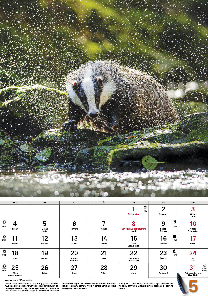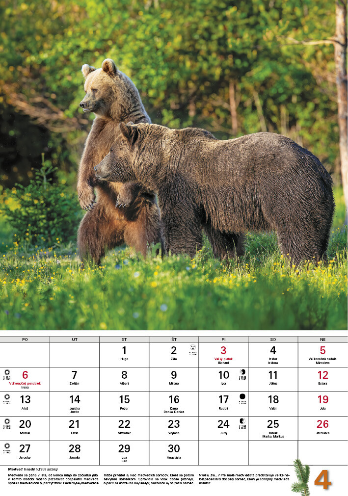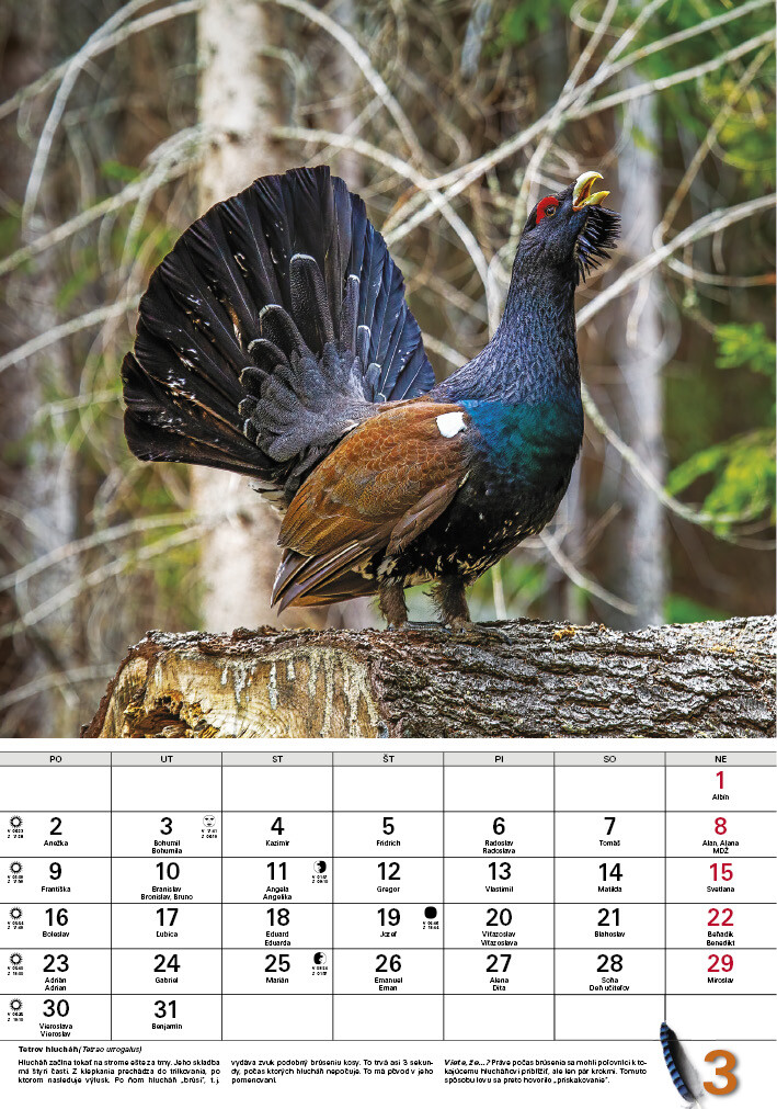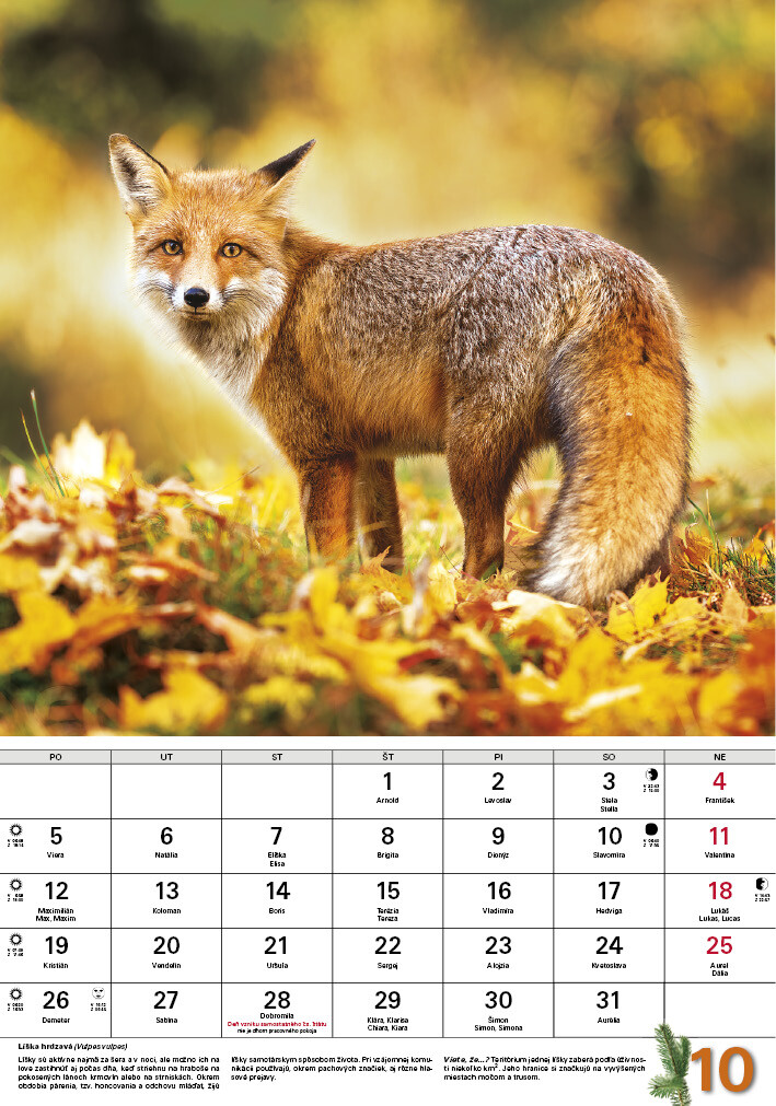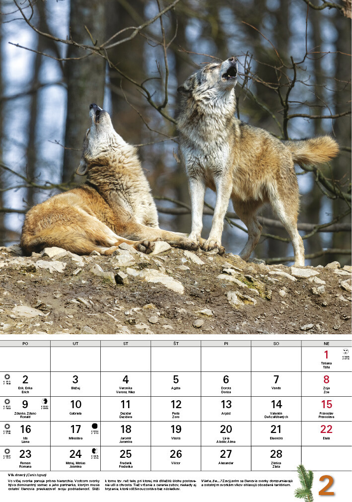 Kalendár pre všetkých milovníkov prírody, lesa a poľovníckej tradície. Každý mesiac prináša nádherné fotografie lesnej zveri v jej prirodzenom prostredí – srnce, jelene, diviaky, bažanty a iné typické druhy slovenskej prírody. Kalendár obsahuje aj praktické informácie pre poľovníkov: fázy mesiaca, poľovnícke sezóny, prehľad období lovu a užitočné poznámky.
