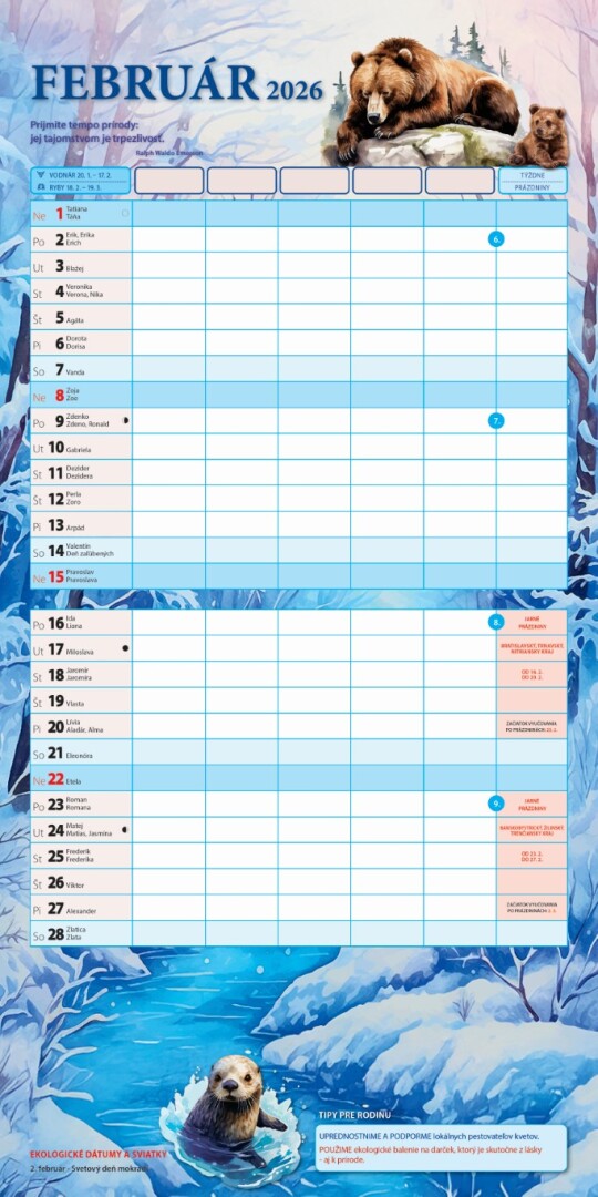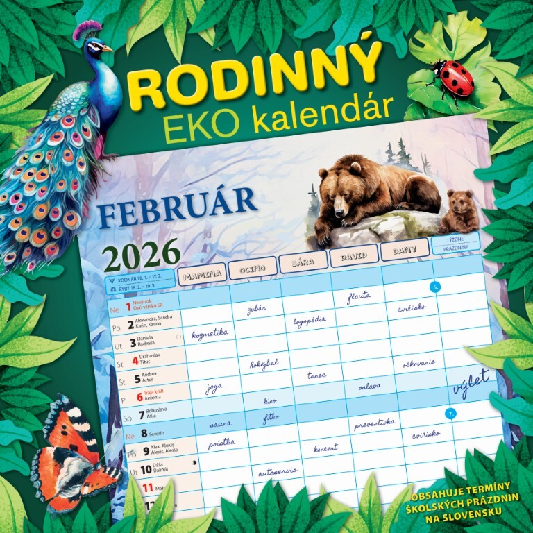 Tento praktický kalendár ponúka veľa priestoru na zapisovanie aktivít celej domácnosti – každý člen si nájde svoj stĺpec! Každý mesiac je navyše doplnený o krásne ilustrácie, inšpiratívne mottá, ekologické dátumy a sviatky, tipy pre rodinu, prázdniny. Súčasťou balenia sú aj samolepky s emotikonmi a piktogramami, ktorými môžete jednoducho vyjadriť svoje činnosti, pocity a emócie – hravo a prehľadne. Kalendár obsahuje aj pero. Ideálny pomocník pre organizovanú, ekologicky zmýšľajúcu a hravú domácnosť! Odporúčame ako darček spolu s Rodinným stolovým kalendárom S26-26.