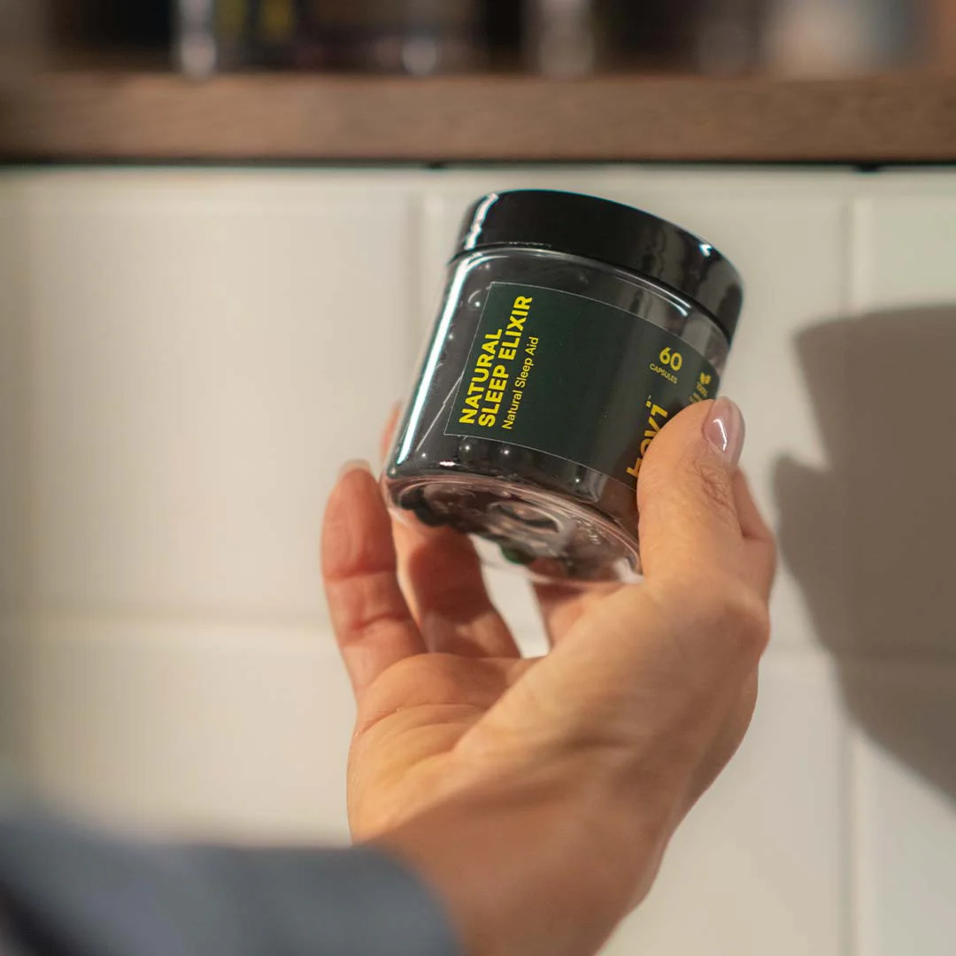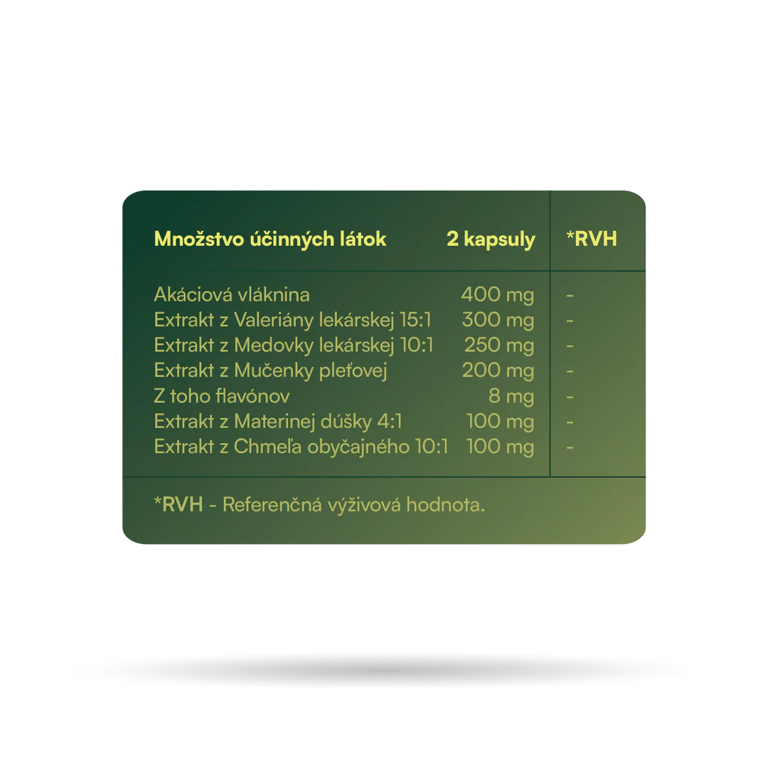 Sleep Elixír je bylinný nápoj s čistým zložením pre pokojný a neprerušovaný spánok. Obsahuje výťažky z medovky, mučenky, levandule, harmančeka, bazalky posvätnej, L-theanín a prírodný magnézium bisglycinát. Uvoľňuje telo aj myseľ, skracuje čas zaspávania a zlepšuje kvalitu spánku. 100% prírodné zelené zafarbenie kapsule vďaka chlorofylu. Balenie: 60 kapsúl (1 mesiac)
