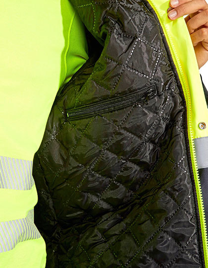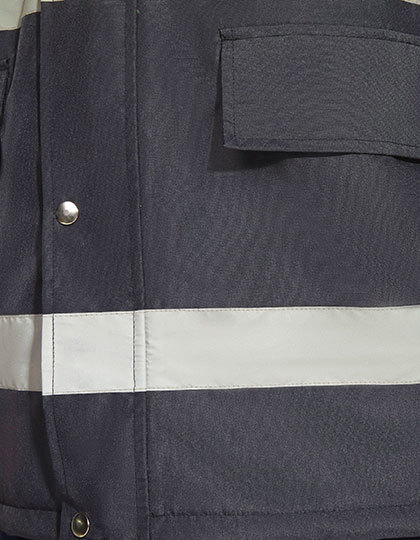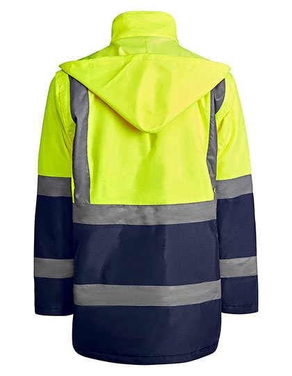 Kombinovaná, prešívaná reflexná parka | Nepremokavá tkanina s tepelne lepenými švami | Skladacia kapucňa s nastaviteľnou sťahovacou šnúrkou | Dva vodorovné reflexné prúžky na trupe a rukávoch a zvislé reflexné prúžky na ramenách | Náprsné vrecko s chlopňou a zapínaním na suchý zips a držiakom na menovku | Dve predné vrecká s chlopňou | Vnútorné vrecko na zips | Skryté manžety na rukách v rebrovanom úplete 1x1 | Stredová léga s kovovými gombíkmi na zapínanie a stredový zips s dvoma jazdcami | Ďalšie vrecko na sieťotlač | Certifikácia CE podľa noriem: EN ISO 13688:2013 a EN ISO 20471:2013/A1:2016, Trieda I: 55221 – 55223 – 52221 – 23221, II: 23221, Trieda II: 22