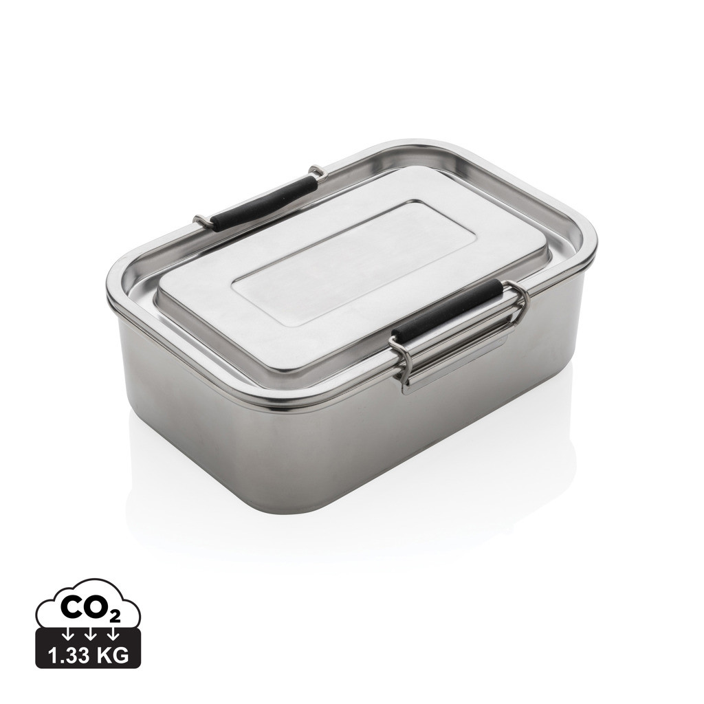 Veľmi pevná a odolná krabička na jedlo s dvoma klipmi pre zaistenie maximálnej nepriepustnosti. Jednoduché obľúbené prevedenie vhodné do práce, školy alebo kamkoľvek na cesty. Vrátane vnútorného rozdeľovača priestoru, ktorý je možné vybrať pre ľahké čistenie. Neodporúča sa do umývačky riadu alebo mikrovlnnej rúry. Vyrobená z RCS recyklovanej nehrdzavejúcej ocele. RCS (Recycled Claim Standard) je globálny štandard, ktorý umožňuje overiť použitie recyklovaného materiálu v produkte naprieč celým dodávateľským reťazcom. Podiel použitého recyklovaného materiálu vzhľadom na celkovú váhu produktu: 95 %. Vhodné pre studený obsah. Objem: 1 liter. Balené v FSC kraftovej krabičke.