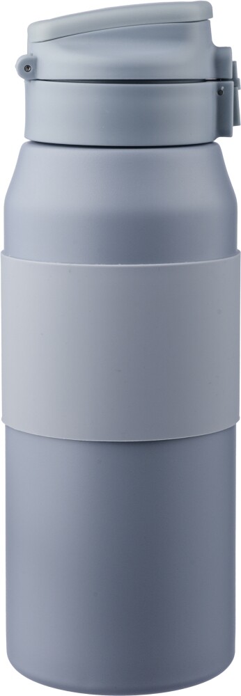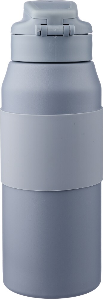 Nerezová dvojstenná fľaša na pitie (800 ml) so silikónovým úchopom na tele, slamkou, PP viečkom a rukoväťou. Vyrobené z nerezovej ocele 304. Stlačením tlačidla otvoríte alebo zatvoríte výtok. Udrží obsah horúci po dobu 8 hodín a studený po dobu 12 hodín. Jednotlivo balené v hnedej kartónovej krabici. Rozmery: 8,8 x 8,8 x 24,5 cm