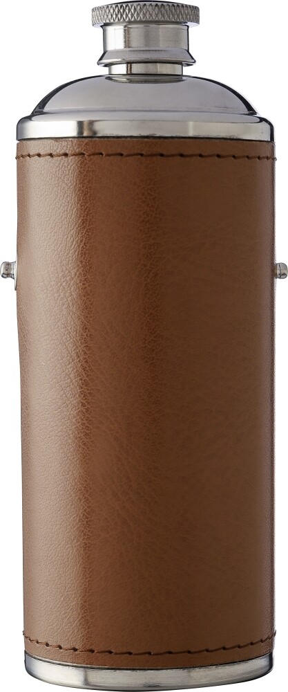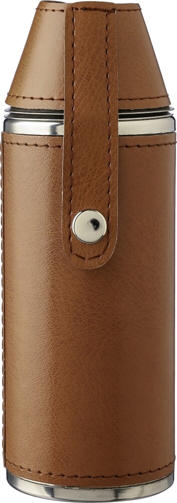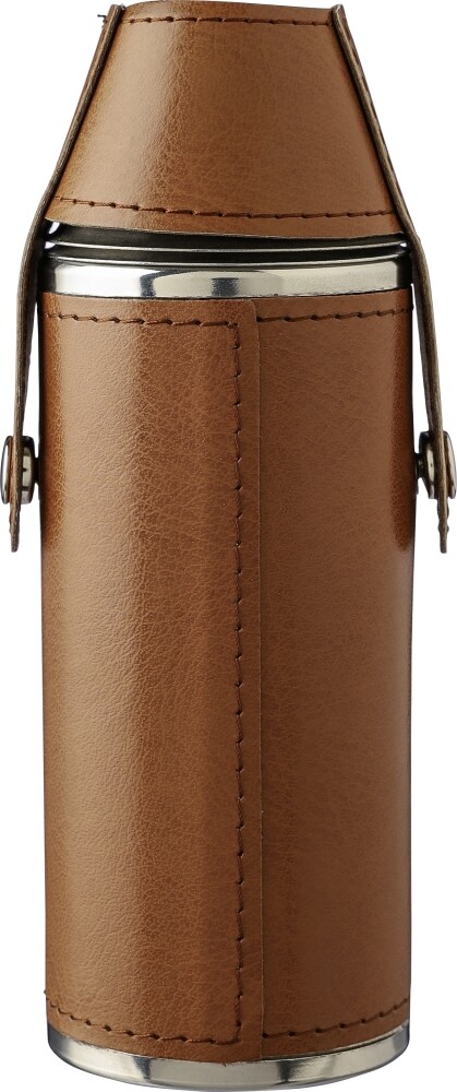Recyklovaná nerezová fľaša (230 ml) s dvoma téglikami (40 ml) a PU puzdrom na vonkajšej strane. Vyrobené z nerezovej ocele 304. Tégliky sú hore pripevnené pomocou cvočkov. Jednotlivo balené v hnedej kartónovej krabici. Rozmery: 15 x 2,3 x 5,1 cm
