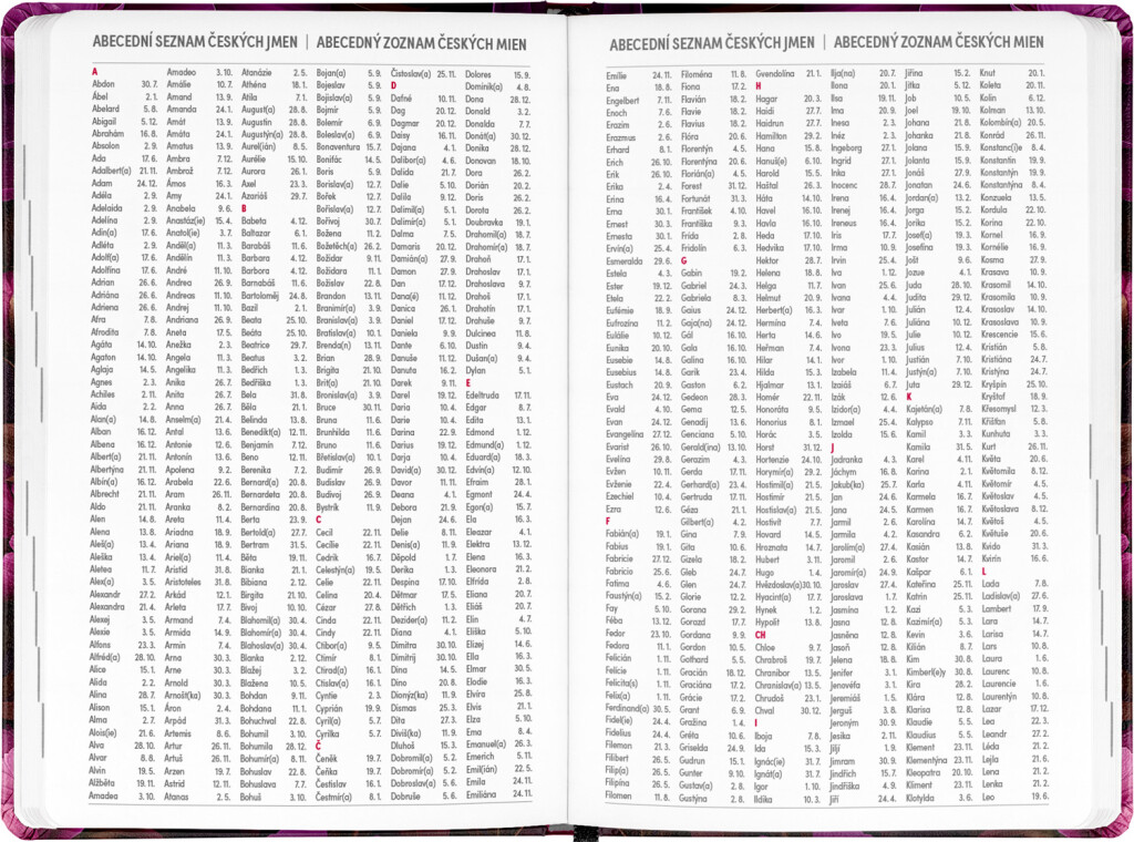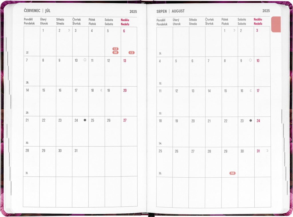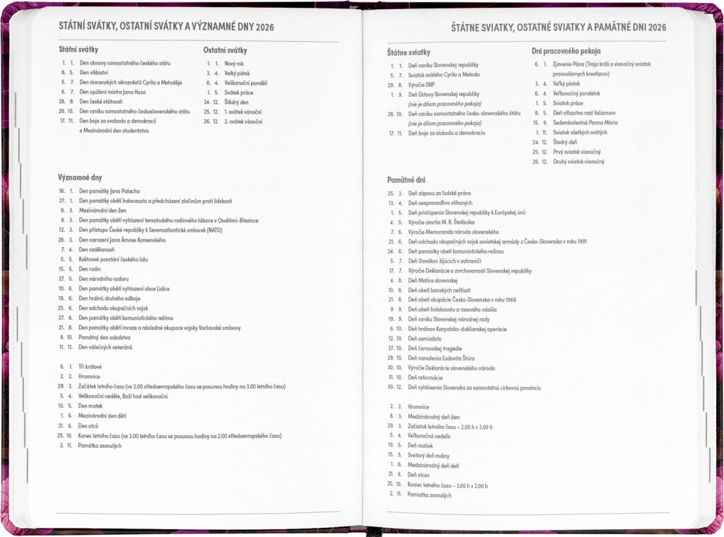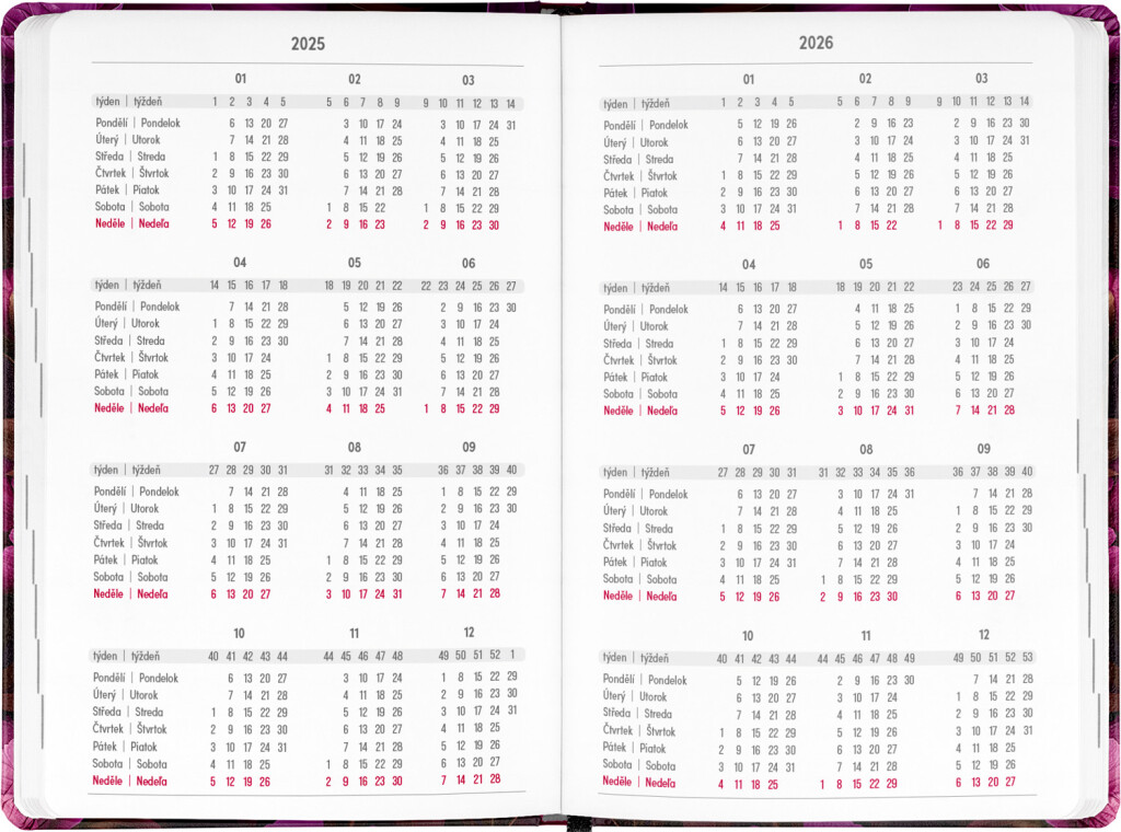 Osemnásťmesačný diár obsahuje prehľad na rok 2025 a 2026, zoznam českých a slovenských mien, česko-slovenské týždenné riadkové kalendárium s menami a sviatkami a priestor na poznámky. Kalendárium začína v júli 2025 a končí v decembri 2026.