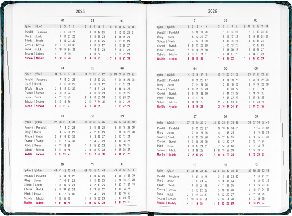 Osemnásťmesačný diár obsahuje prehľad na rok 2025 a 2026, zoznam českých a slovenských mien, česko-slovenské týždenné riadkové kalendárium s menami a sviatkami a priestor na poznámky. Kalendárium začína v júli 2025 a končí v decembri 2026.