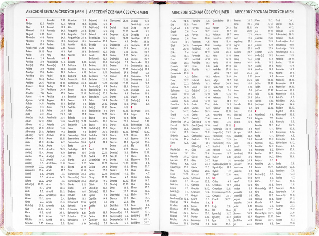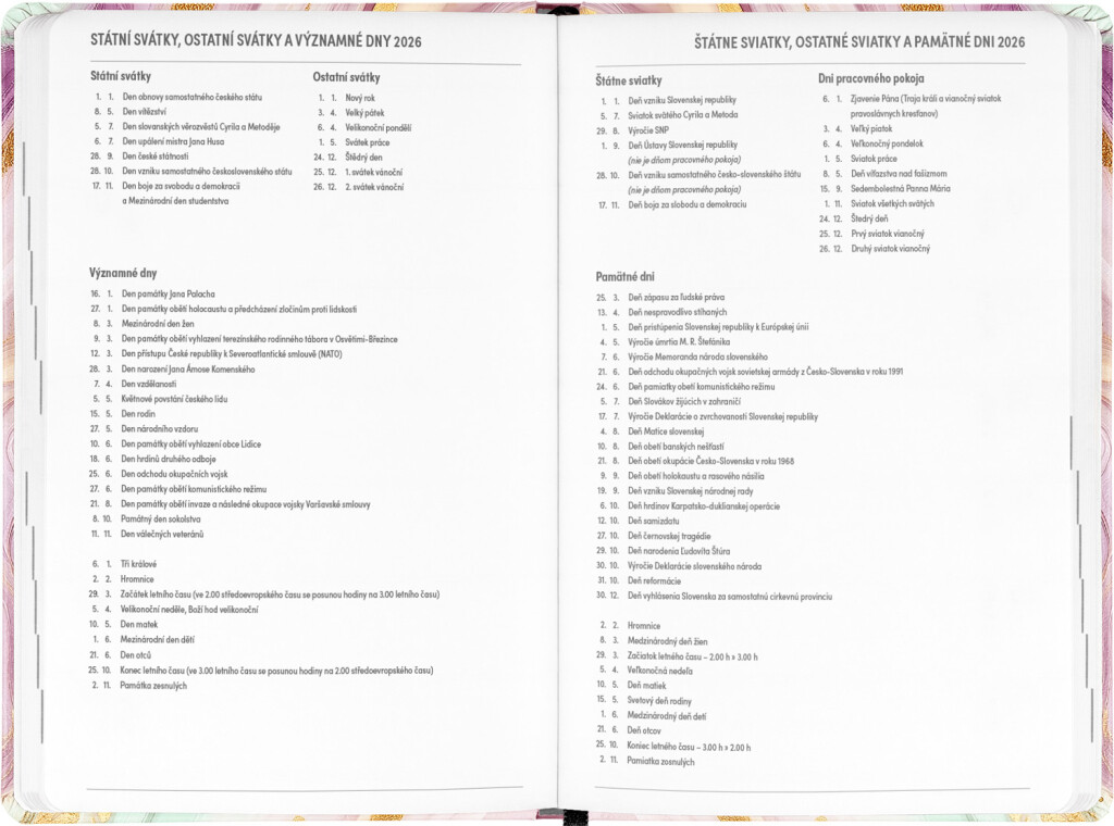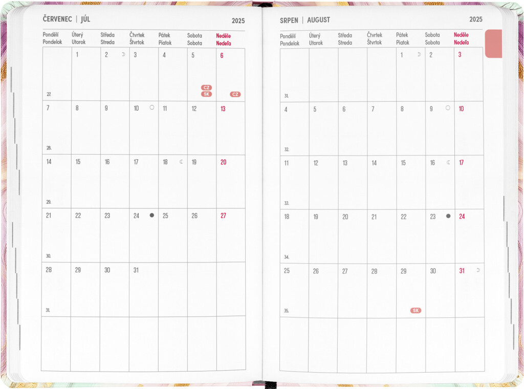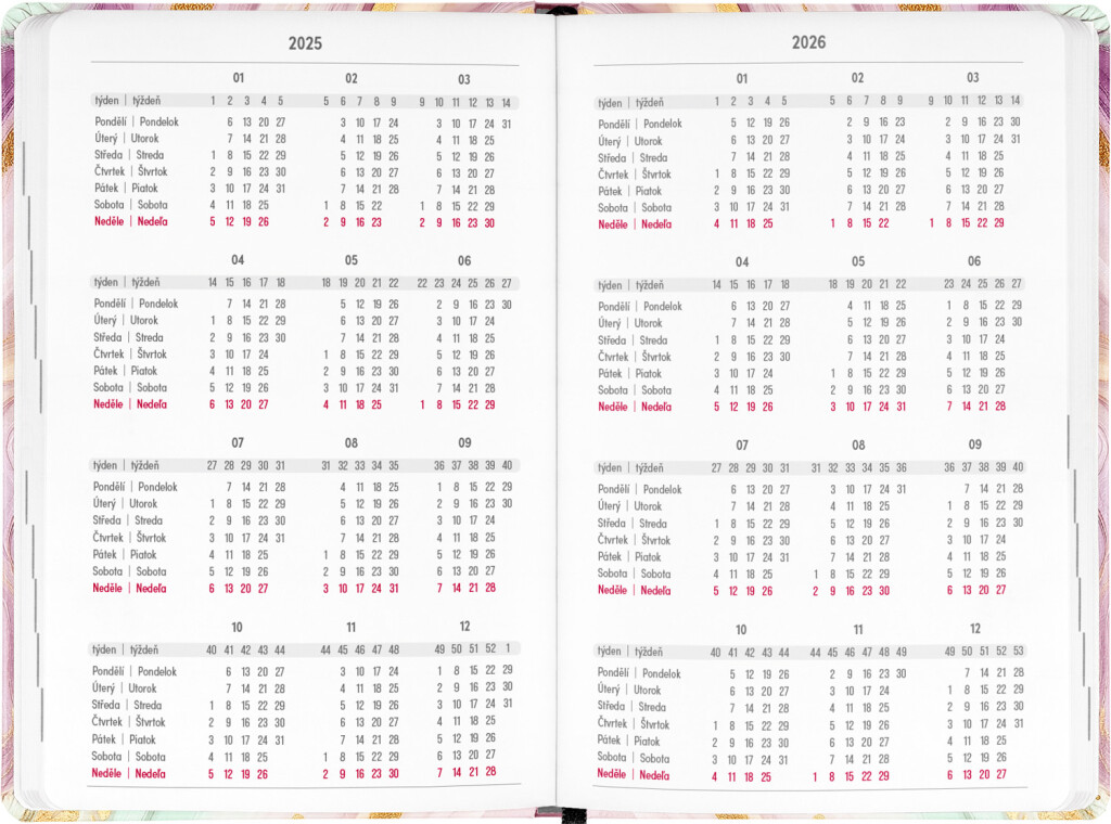 Osemnásťmesačný diár obsahuje prehľad na rok 2025 a 2026, zoznam českých a slovenských mien, česko-slovenské týždenné riadkové kalendárium s menami a sviatkami a priestor na poznámky. Kalendárium začína v júli 2025 a končí v decembri 2026.