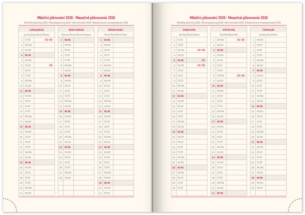 Nový, cenovo dostupný rad diárov s obálkou z ekologického papiera spája štýl a udržateľnosť. Denné rozloženie s česko-slovenským kalendáriom a doplnkovou angličtinou, nemčinou, maďarčinou a ruštinou.