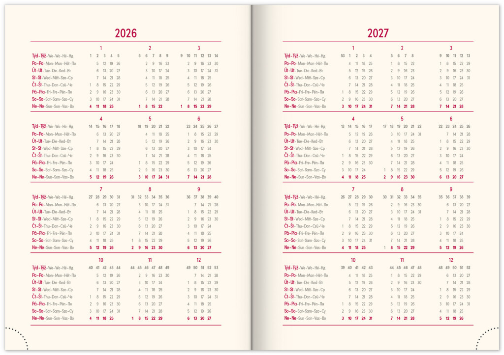 Nová rada diárov v modernom dizajne doplnenom o pevnú gumičku a pútko na pero. Denné rozloženie s česko-slovenským kalendáriom a doplnkovou angličtinou, nemčinou, maďarčinou a ruštinou.