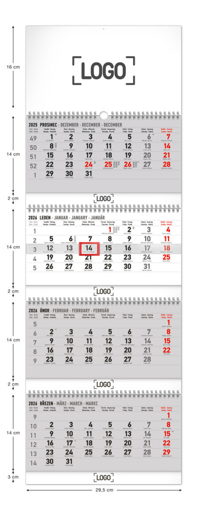 Praktický štvormesačný kalendár s plochou na potlač a náhľadom štyroch mesiacov súčasne môžete vďaka dvojitej špirále pohodlne zložiť do obálky veľkosti A4. Kalendárium obsahuje české mená a svetové sviatky. Vďaka voľnej ploche na potlač sa môže stať úplne originálnym predmetom pre firmy.