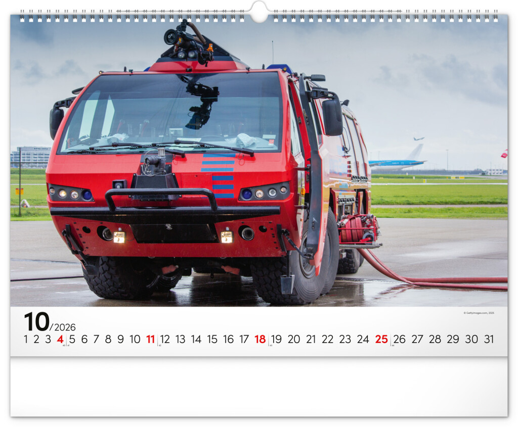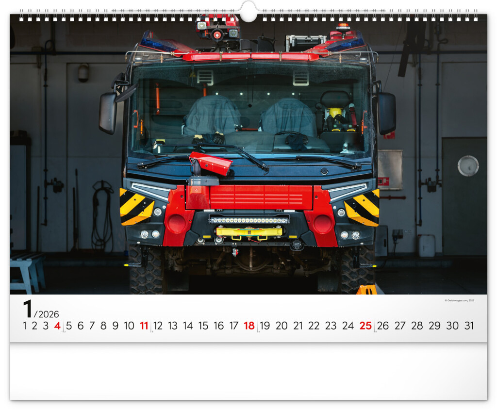 Nástenný kalendár pre všetkých priaznivcov hasičských vozidiel. Dvanásť snímok techniky hasičského záchranného zboru na stránkach kalendára v šírkovom formáte. Fotografie sú doplnené univerzálnym kalendáriom na čiernom pozadí.