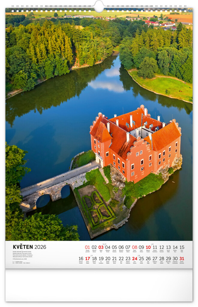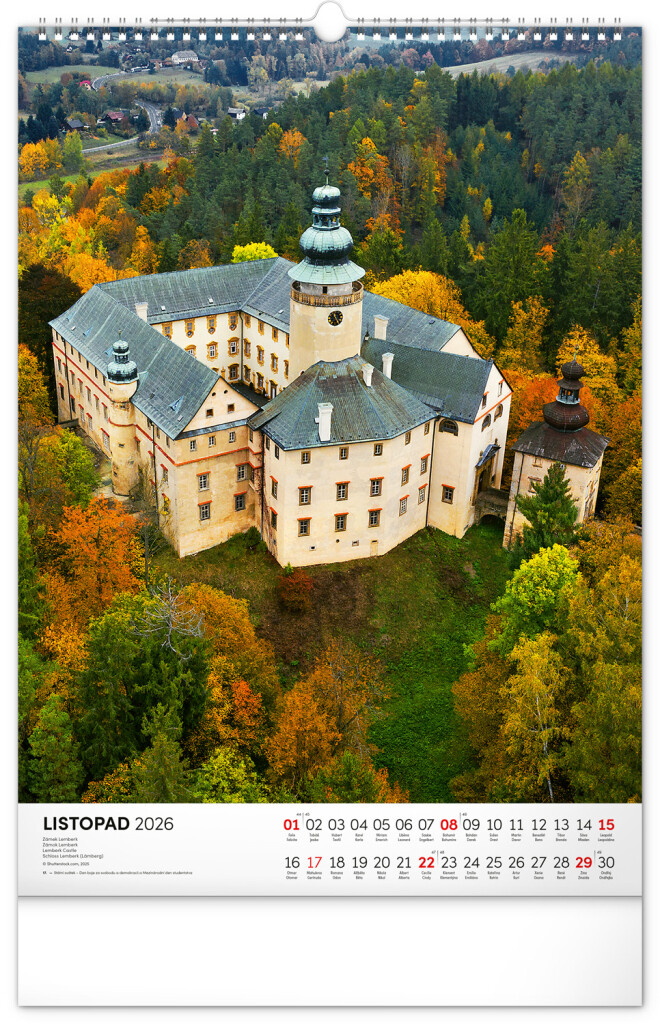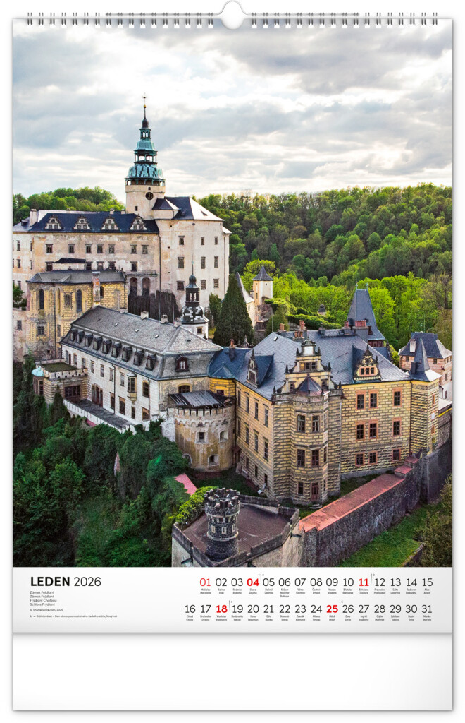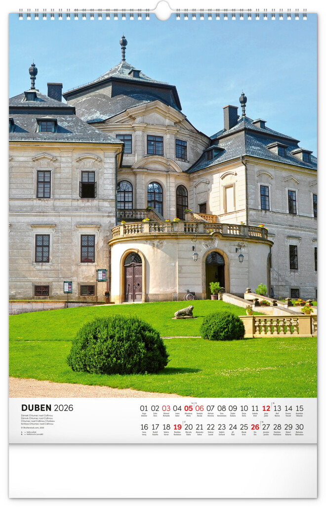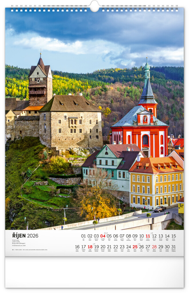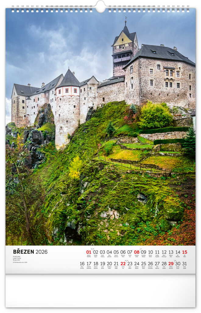 Farebné fotografie Lokte, Lednic, Hlbokej či Bouzova na stránkach nástenného kalendára vo výškovom formáte. Jednoduché kalendárium s českými sviatkami a menami.