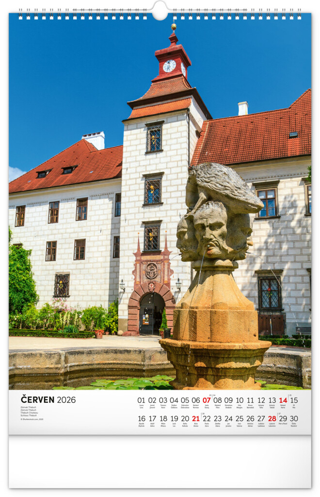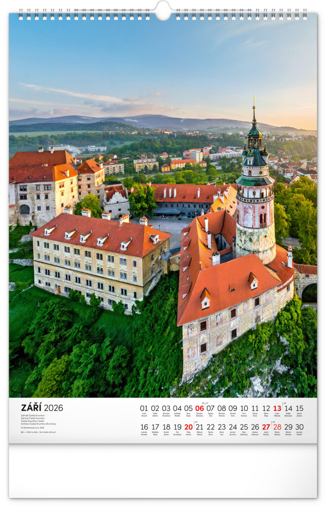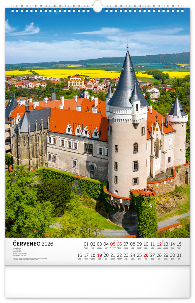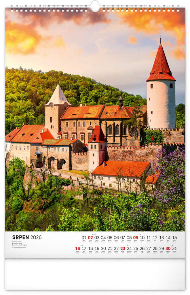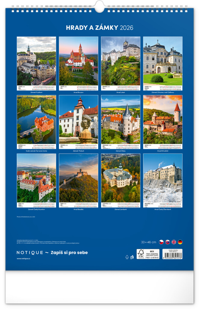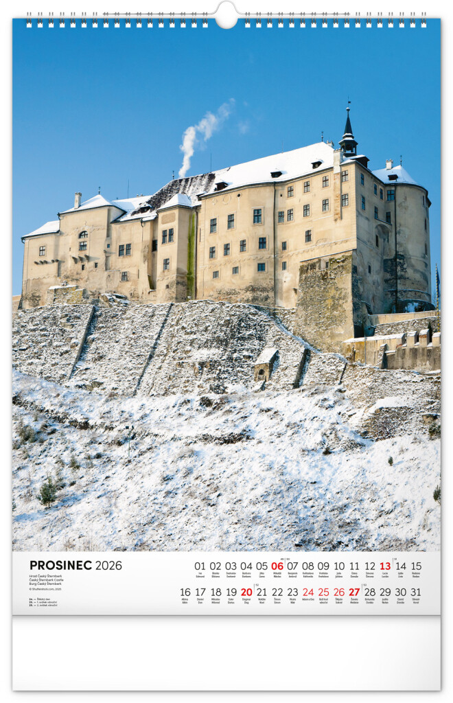 Farebné fotografie Lokte, Lednic, Hlbokej či Bouzova na stránkach nástenného kalendára vo výškovom formáte. Jednoduché kalendárium s českými sviatkami a menami.