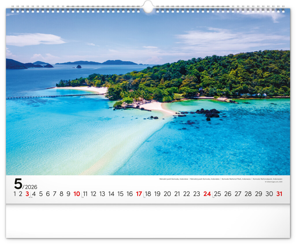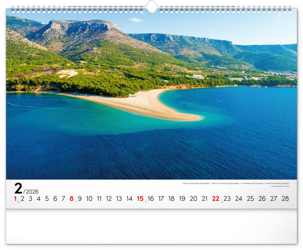 Priezračná tyrkysová hladina, azúrové nebo s bielymi mráčikmi, palmy, lúče slnka, to je skutočný raj na zemi. Dvanásť plážových momentiek z Portugalska, Thajska aj iných svetových destinácií na efektnom bielom pozadí s jednoduchým kalendáriom.