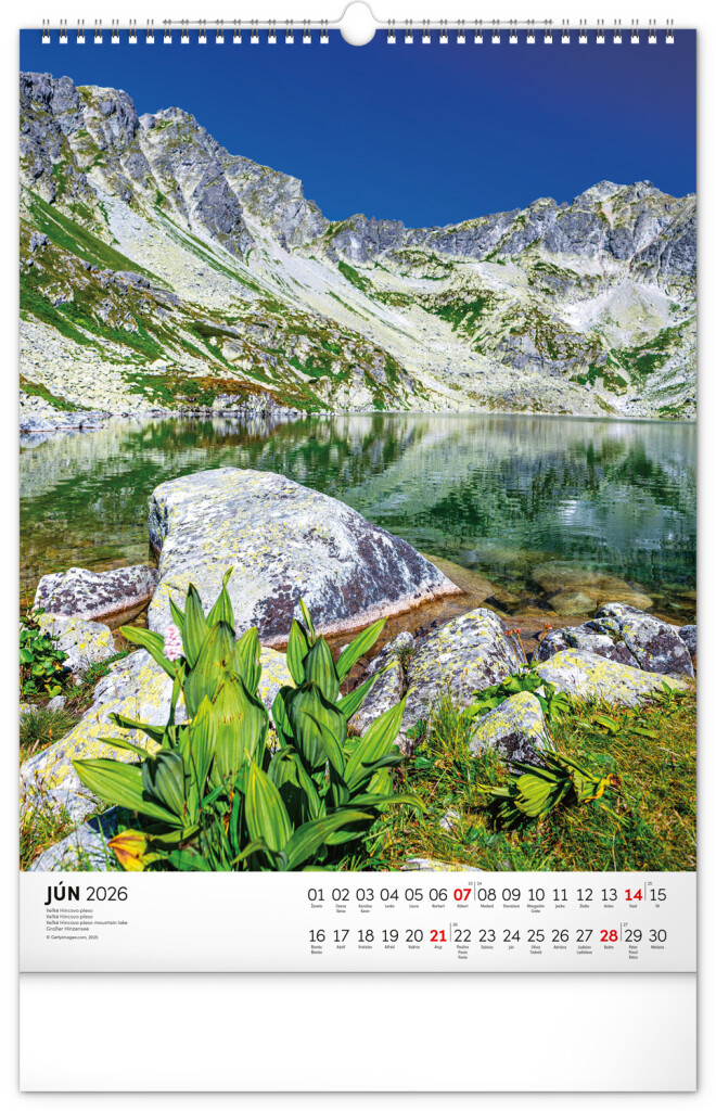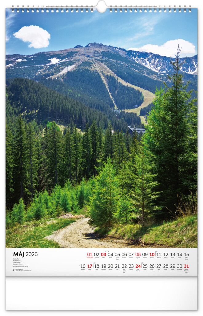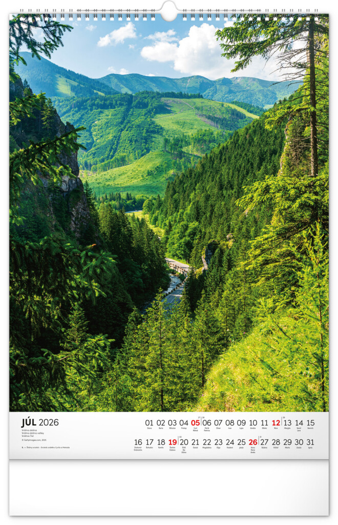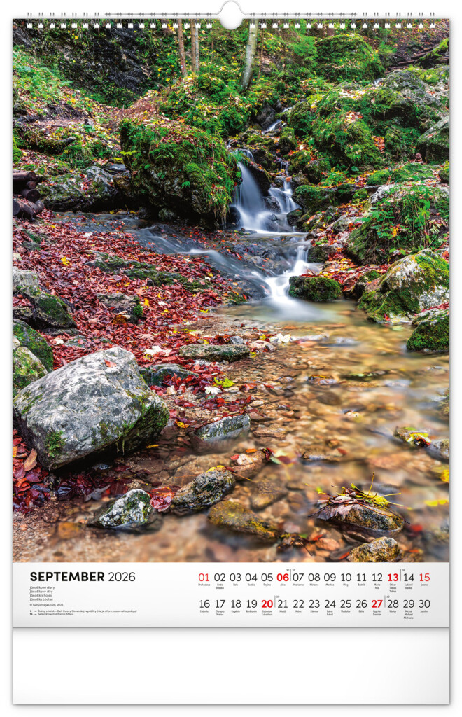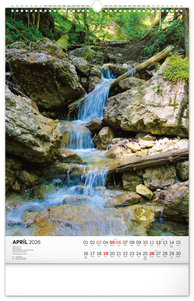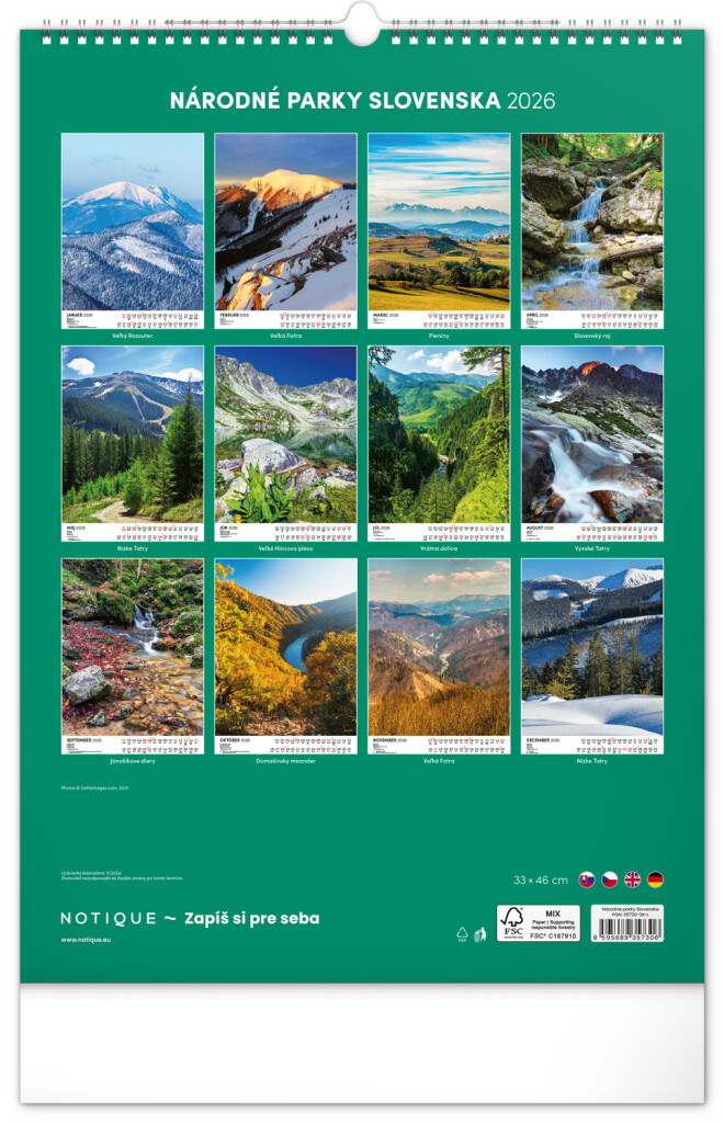 Nástenný kalendár obsahuje dvanásť farebných fotografií zo slovenských národných parkov. Obsahuje slovenské kalendárium s menami na bielom pozadí.