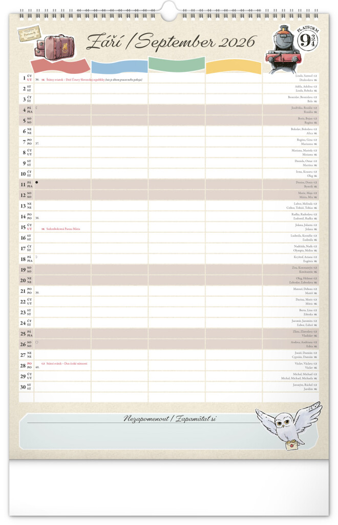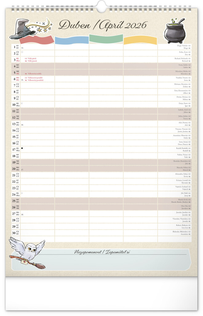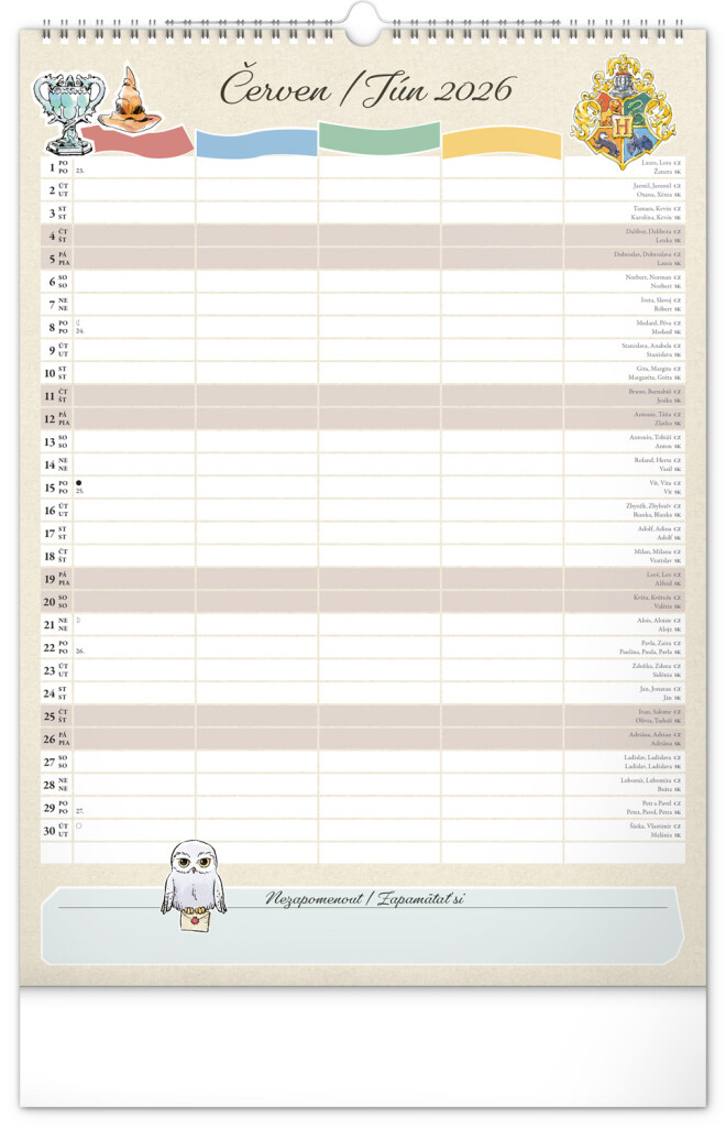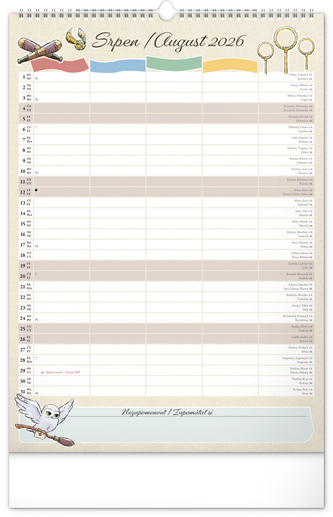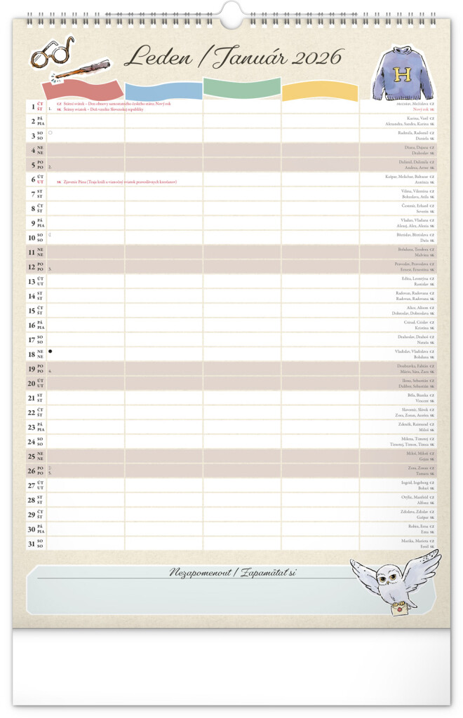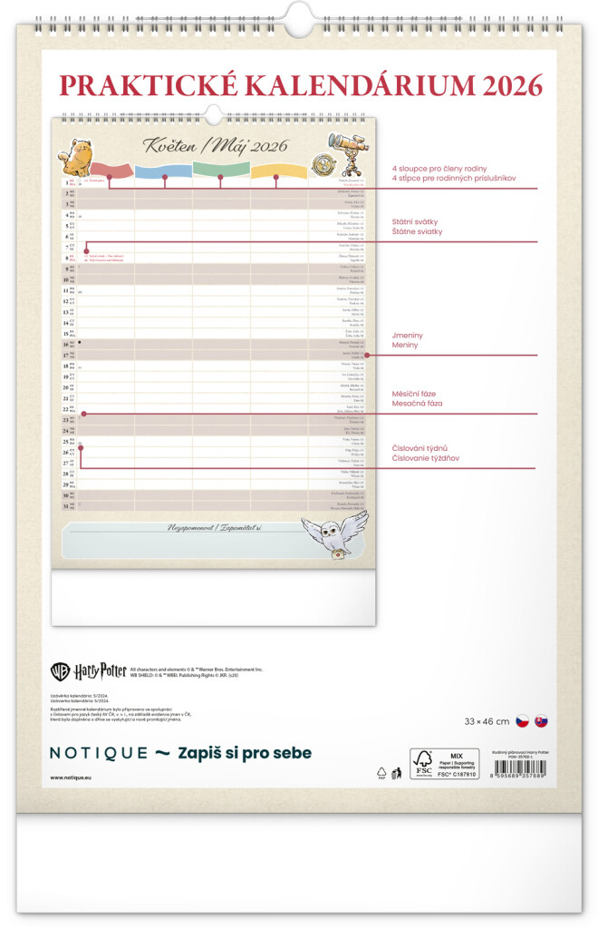 Aj v Rokforte treba mať vo veciach poriadok! Plánujte rodinné aktivity s kalendárom, ktorý každý mesiac prináša kúzelnú atmosféru sveta Harryho Pottera. Kalendár má české a slovenské kalendárium a samostatný plánovač až pre štyroch členov domácnosti, nechýbajú štátne sviatky ani mesačné fázy. Perfektný pomocník pre mudlov aj čarodejníkov.