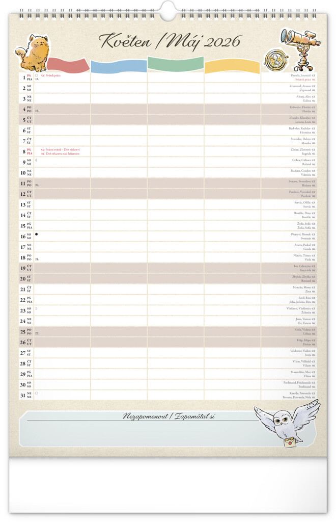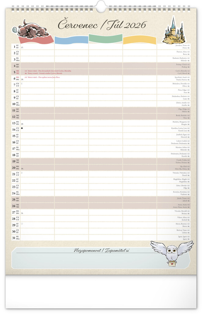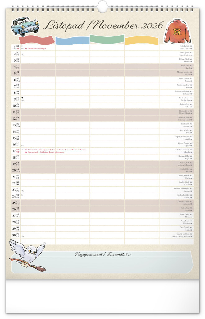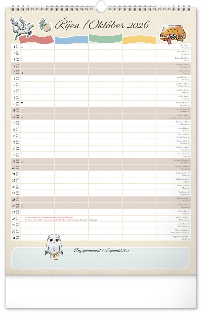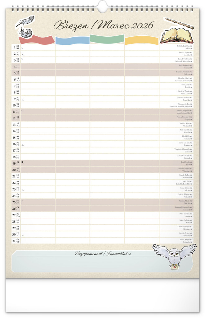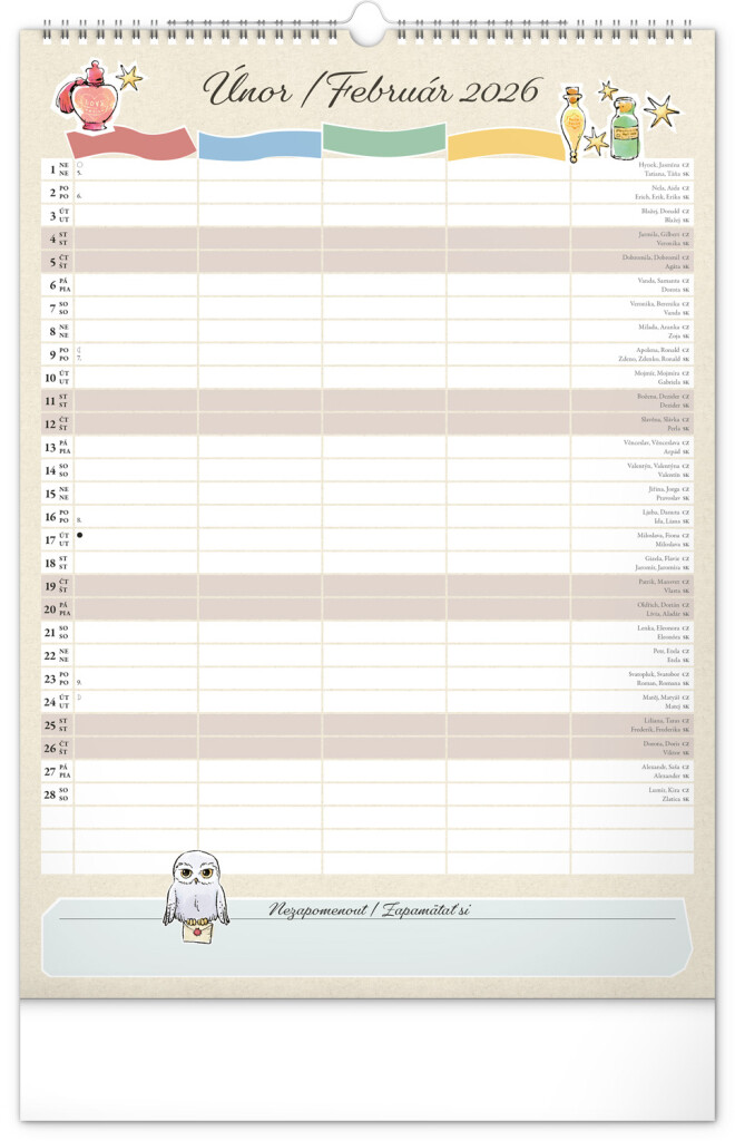 Aj v Rokforte treba mať vo veciach poriadok! Plánujte rodinné aktivity s kalendárom, ktorý každý mesiac prináša kúzelnú atmosféru sveta Harryho Pottera. Kalendár má české a slovenské kalendárium a samostatný plánovač až pre štyroch členov domácnosti, nechýbajú štátne sviatky ani mesačné fázy. Perfektný pomocník pre mudlov aj čarodejníkov.