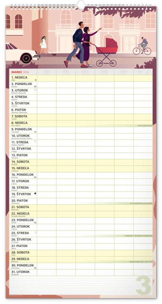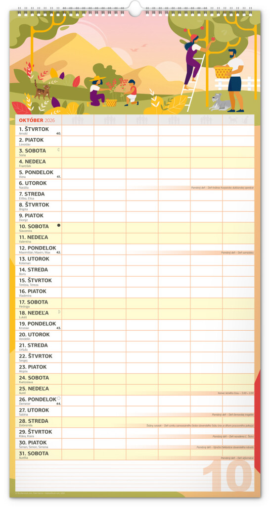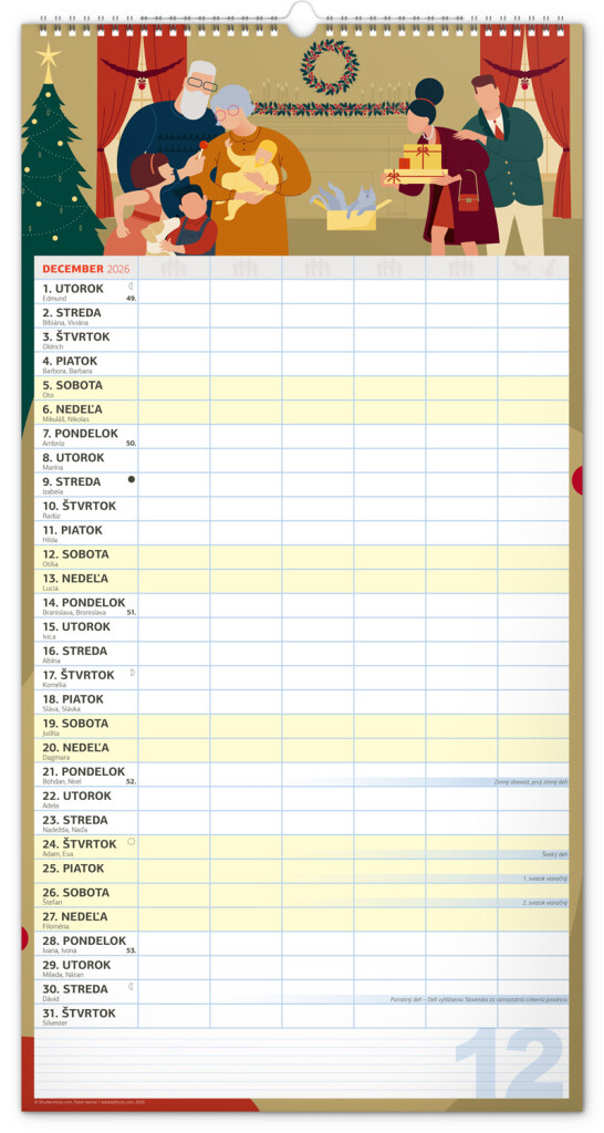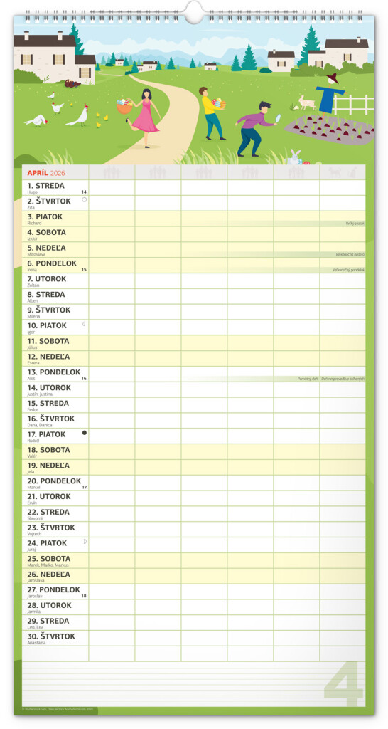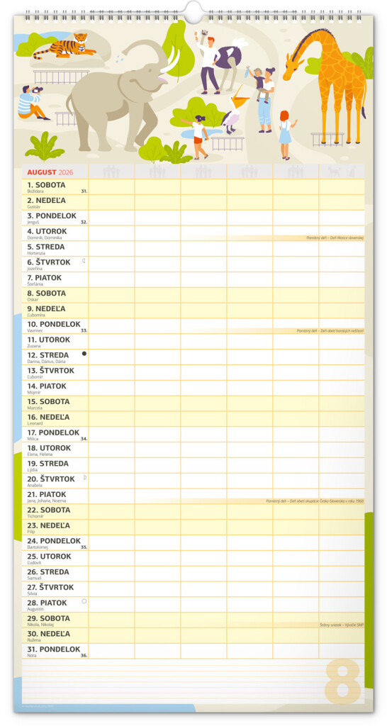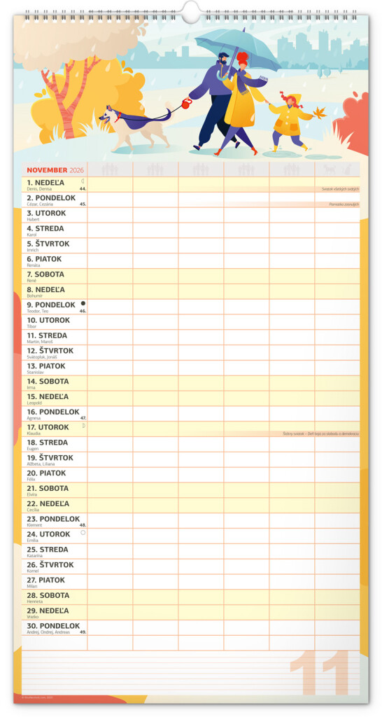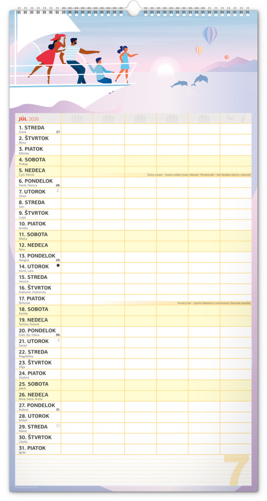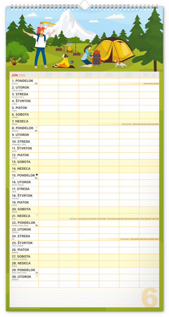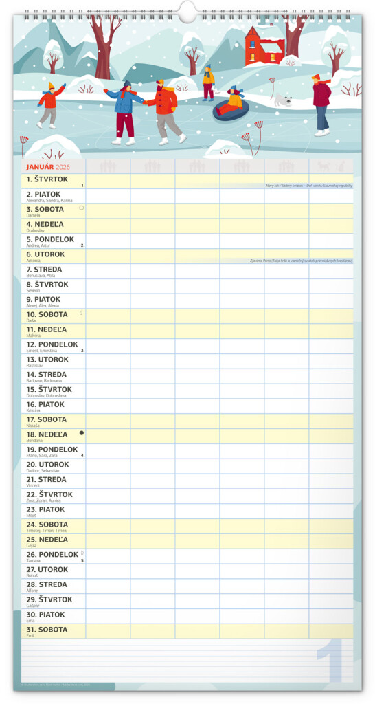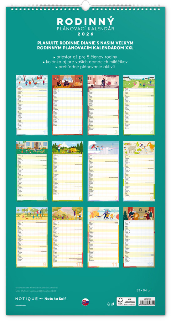 Veľký formát kalendára pre celú rodinu. Slovenské kalendárium a samostatný plánovač aktivít až pre šesť členov domácnosti dopĺňajú veselé grafické motívy pre každé ročné obdobie. Vďaka dostatočnému priestoru na poznámky vám neutečie žiadna udalosť.