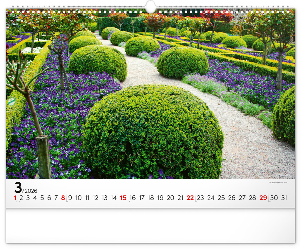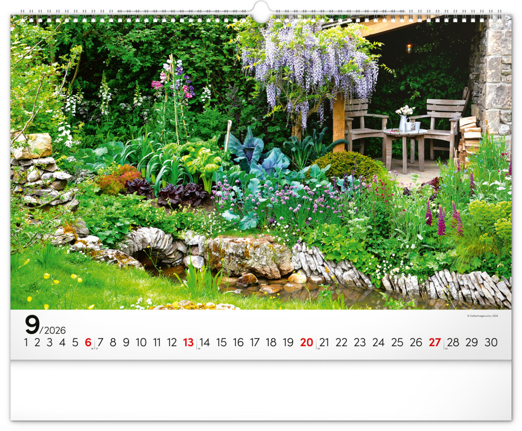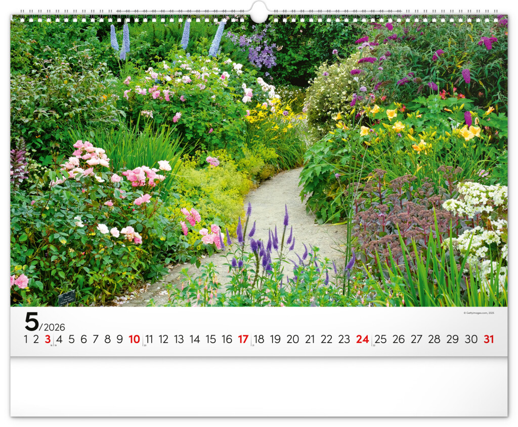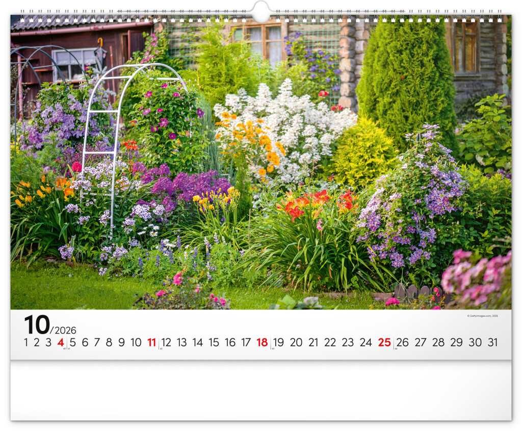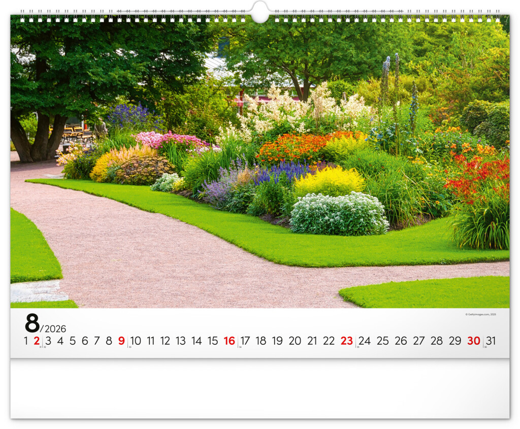 Dvanásť snímok zachytávajúcich pominuteľnú krásu kvetov v záhradách. Vy si však budete pohľad na nádherné farebné záhrady užívať po celý rok. Záhrady, oázy pokoja a relaxácie v nástennom kalendári dopĺňa univerzálne kalendárium so zvýraznenými nedeľami na čiernom pozadí.