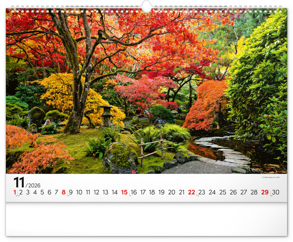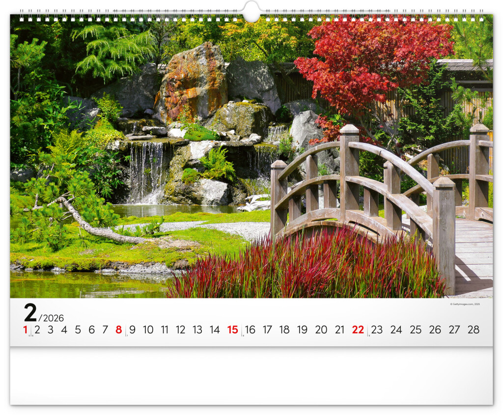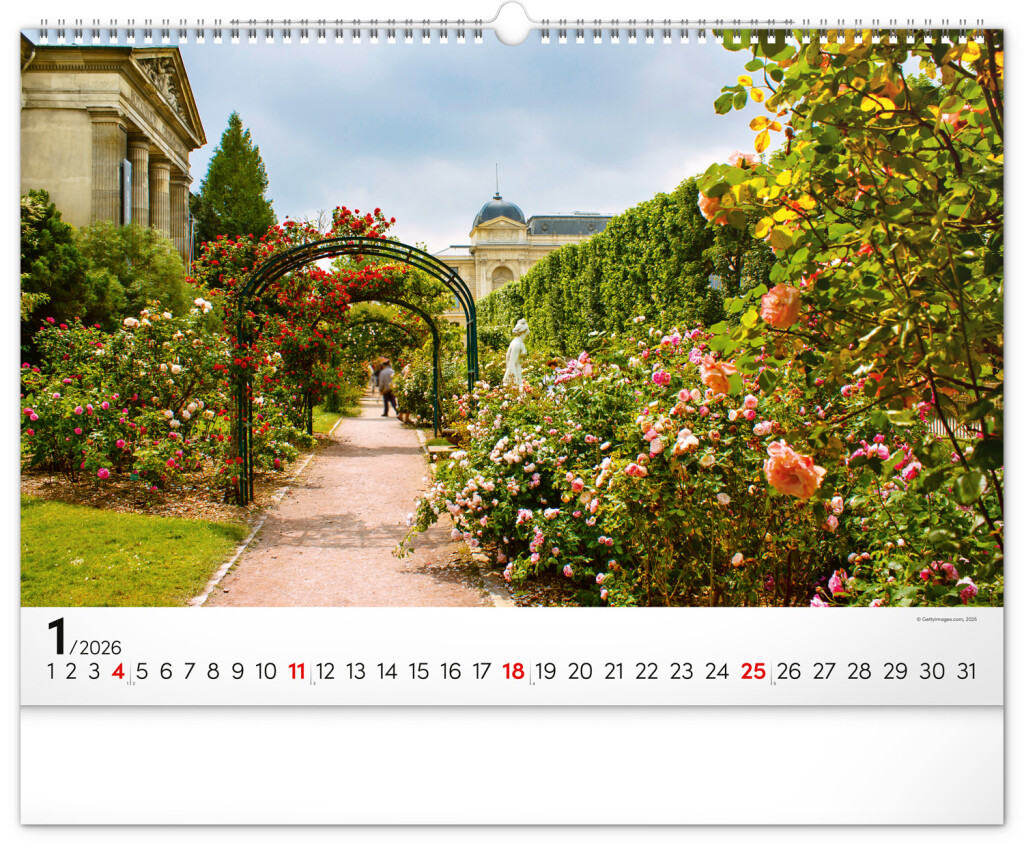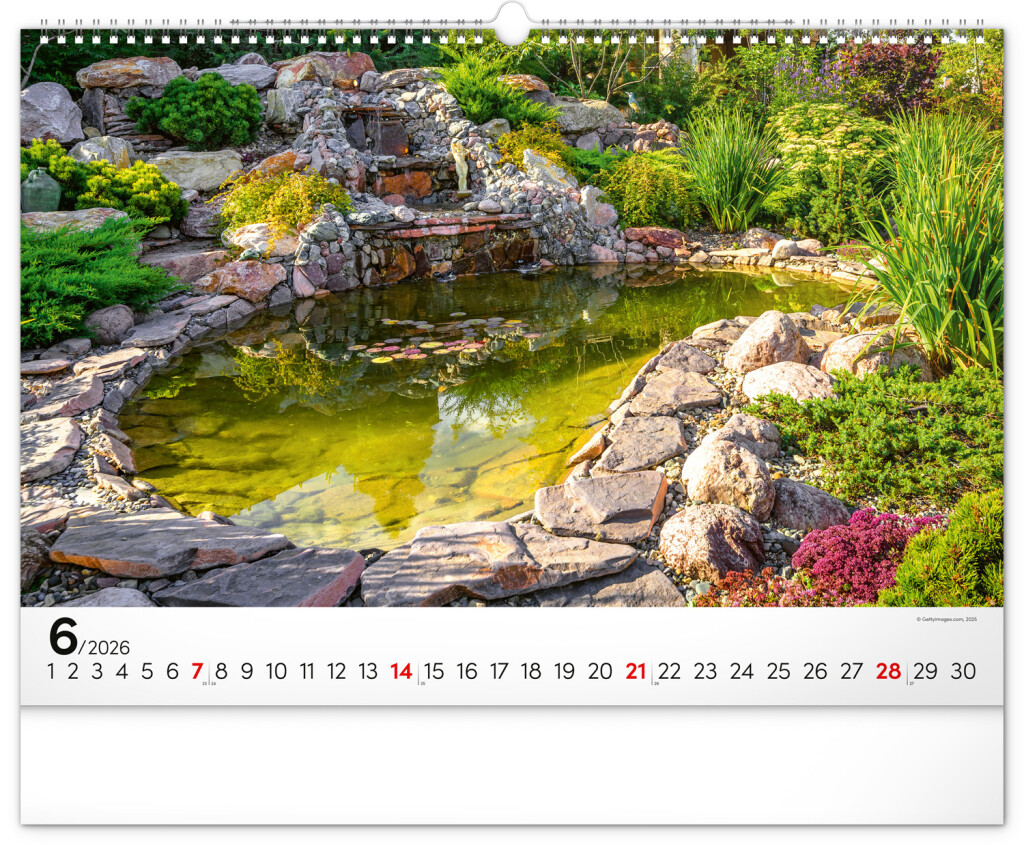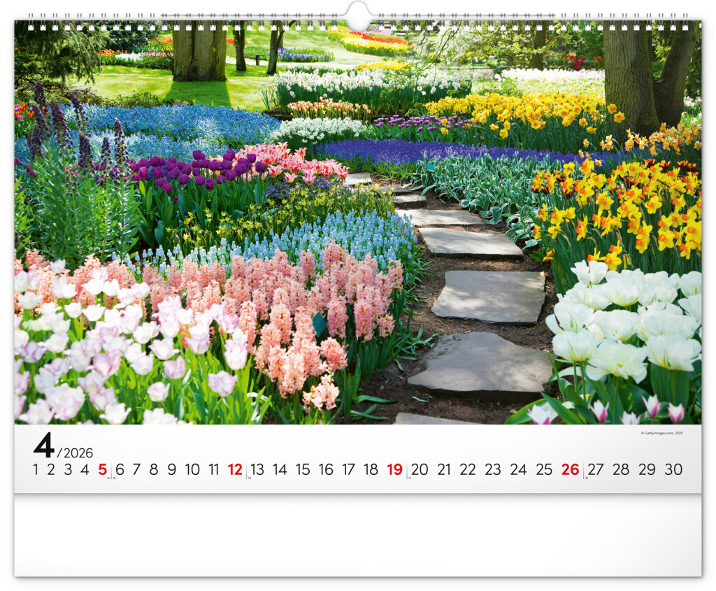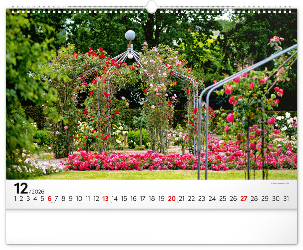 Dvanásť snímok zachytávajúcich pominuteľnú krásu kvetov v záhradách. Vy si však budete pohľad na nádherné farebné záhrady užívať po celý rok. Záhrady, oázy pokoja a relaxácie v nástennom kalendári dopĺňa univerzálne kalendárium so zvýraznenými nedeľami na čiernom pozadí.