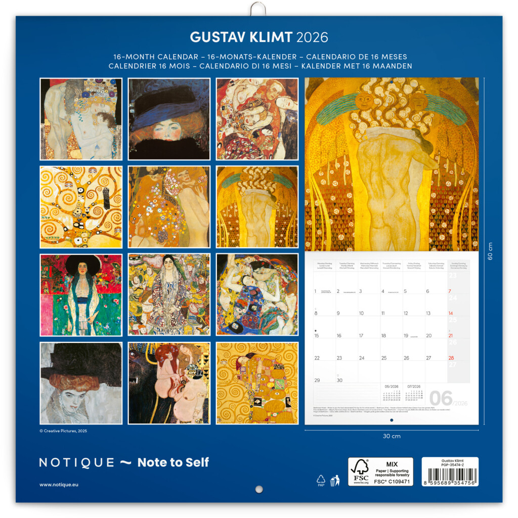 Obrazy populárneho secesného maliara Gustava Klimta na stránkach poznámkového kalendára. Obsahuje prehľadný kalendár od septembra 2025 do decembra 2026 v šiestich jazykoch, fázy mesiaca, dôležité sviatky a priestor na poznámky ku každému dňu.