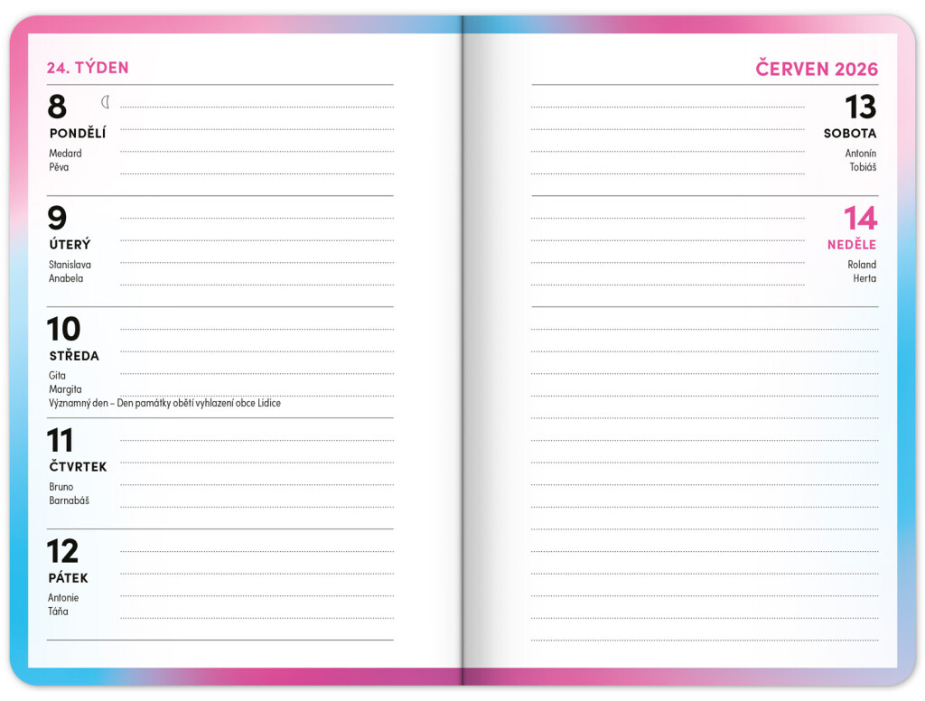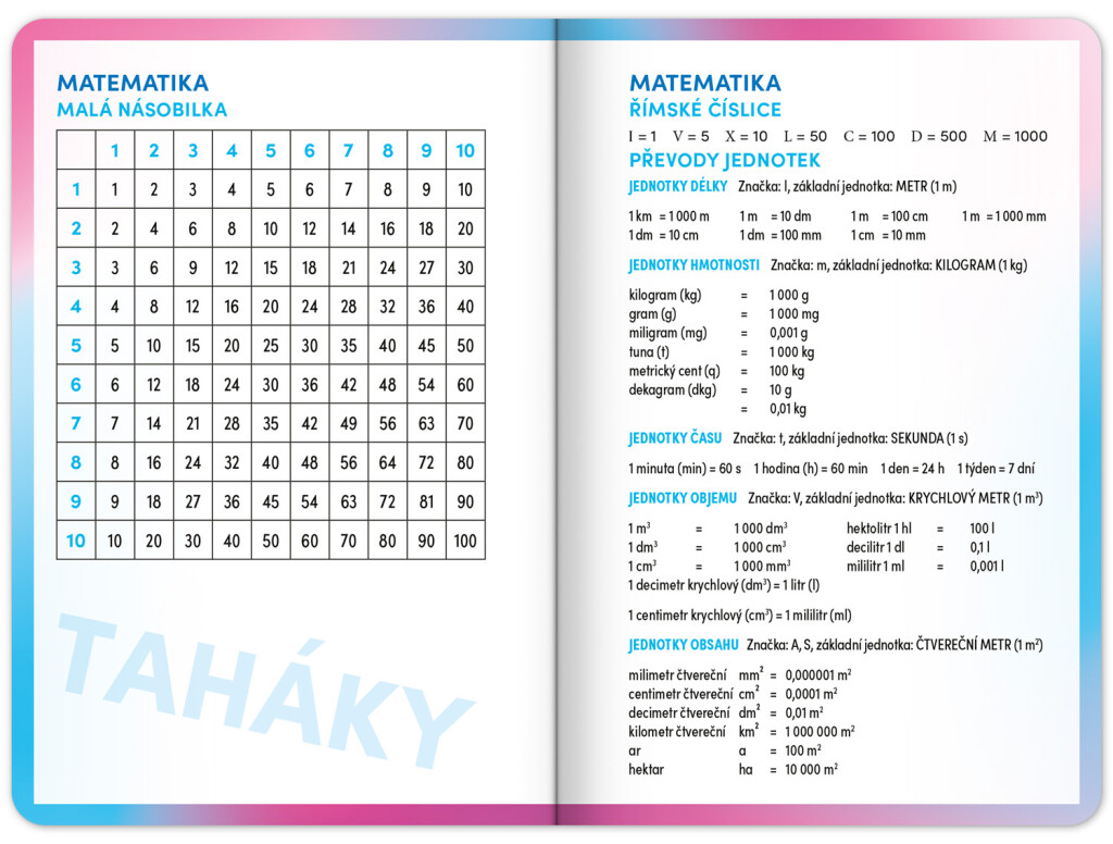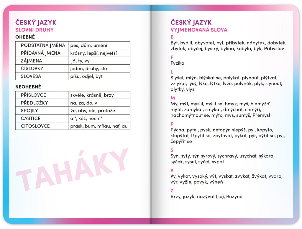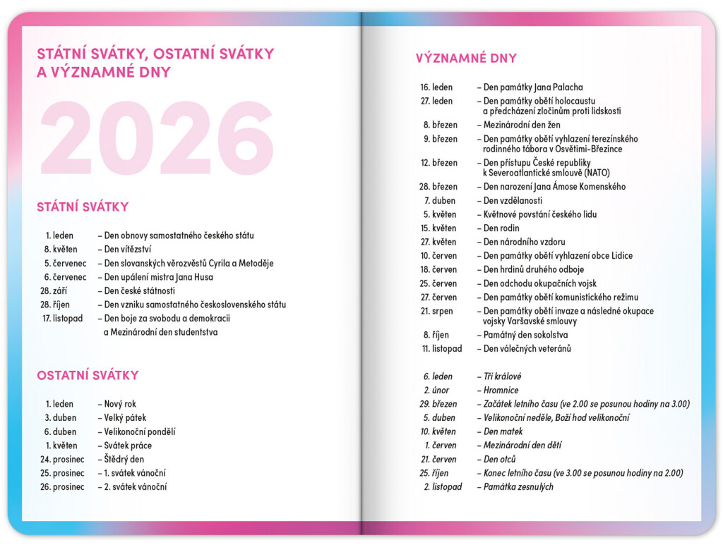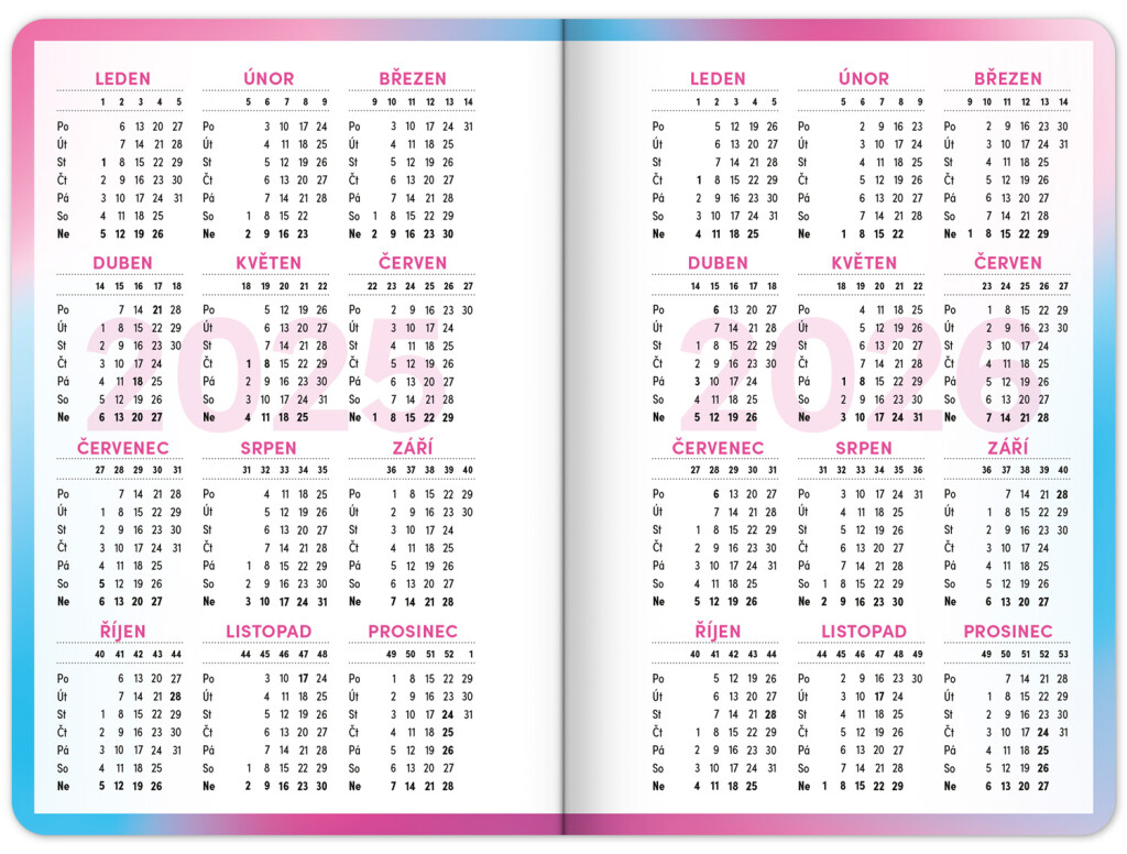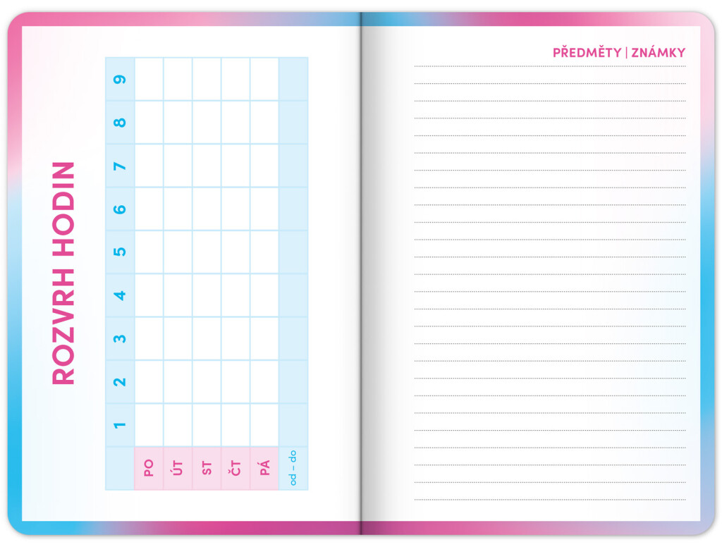 Školský diár obsahuje prehľad na rok 2025 a 2026, české týždenné riadkové kalendárium s menami a sviatkami, rozvrh hodín, priestor na poznámky a základné poznatky zo slovenčiny, angličtiny, matematiky a fyziky pre školákov a školáčky. Kalendárium začína v septembri 2025 a končí v decembri 2026.