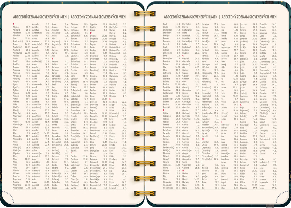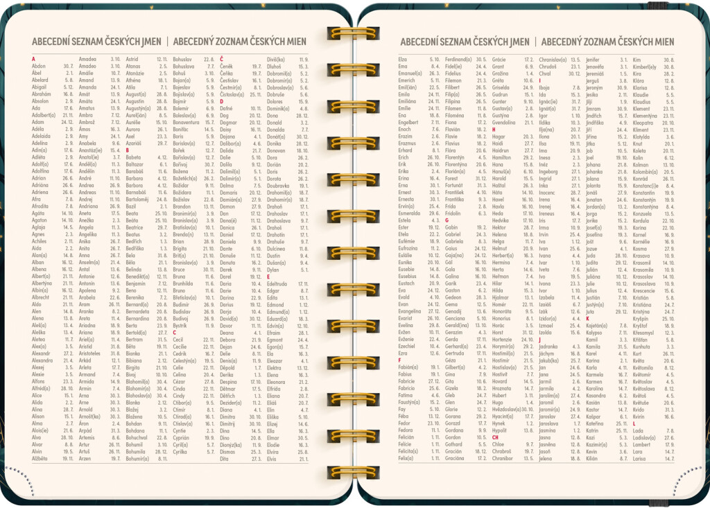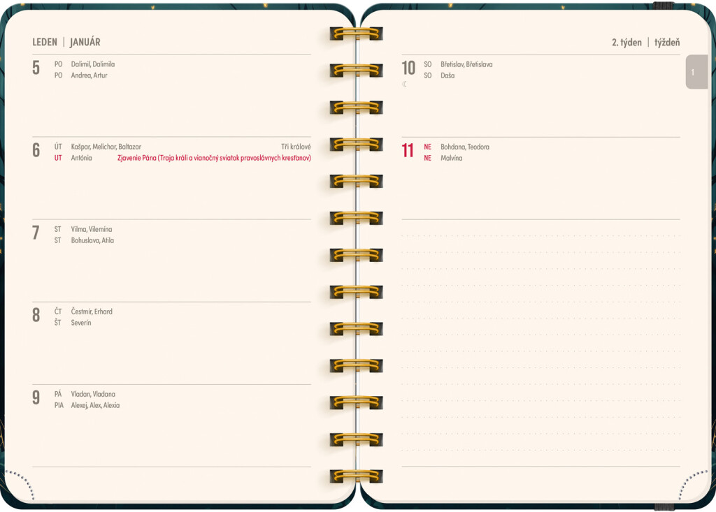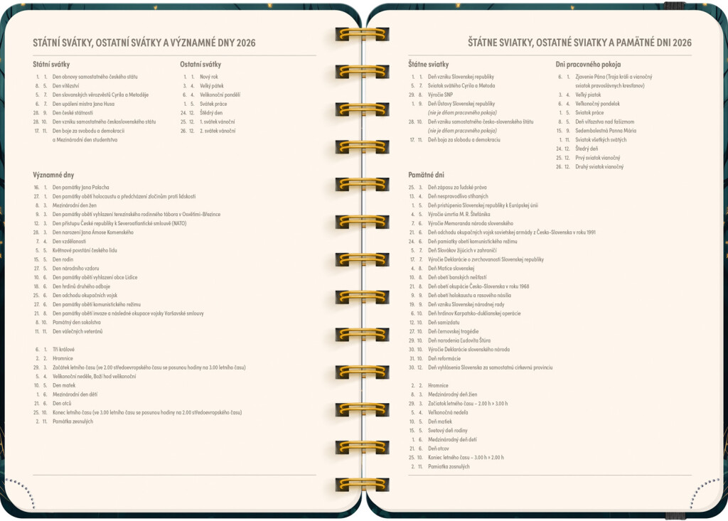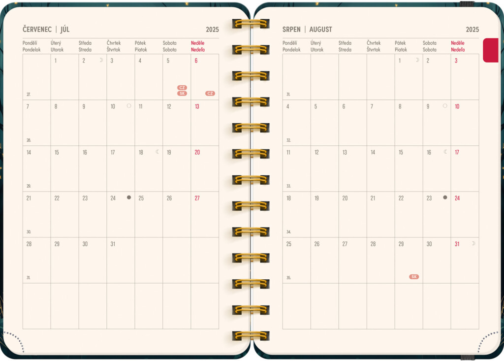 Osemnásťmesačný diár obsahuje prehľad na rok 2025 a 2026, zoznam českých a slovenských mien, česko-slovenské týždenné riadkové kalendárium s menami a sviatkami a priestor na poznámky. Kalendárium začína v júli 2025 a končí v decembri 2026.