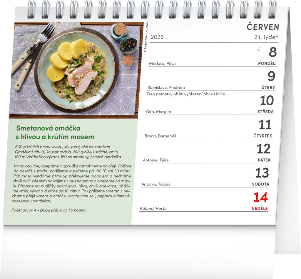 V kalendári nájdete 53 starostlivo vybraných receptov z tradičnej slovenskej kuchyne. Týždenné kalendárium s priestorom pre poznámky obsahuje aj sviatky, pamätné dni, mesačné fázy a prehľad na celý rok.