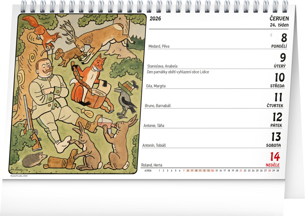 Preneste sa prostredníctvom unikátnych ilustrácií Jozefa Lady do starých čias a nechajte na seba dýchnuť kúzlo idylického života na vidieku. Týždenný stolný kalendár s českými menami obsahuje aj sviatky, pamätné dni, mesačné fázy a prehľad na celý rok 2026 a 2027.