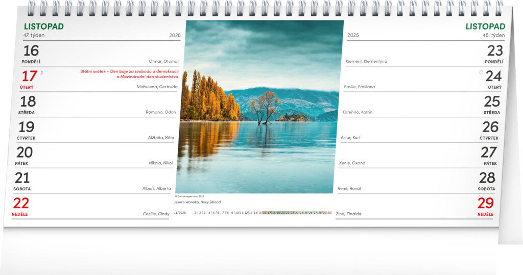 V 14-dennom stolnom kalendári na vás čakajú úchvatné zábery krajiny z celého sveta, ďalej české kalendárium, sviatky a pamätné dni aj mesačné fázy. To všetko v prehľadnom dvojtýždňovom rozvrhnutí.