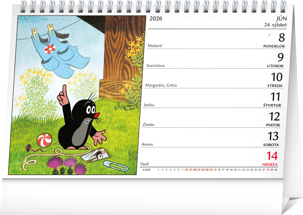 Krtkovho dobrodružstva si prial v detstve prežívať snáď každý z nás. Praktický stolný kalendár s ilustráciami Zdeňka Milera z obľúbených príbehov o Krtkovi obsahuje jeden obrázok na každý týždeň, kalendárium so slovenskými menami, sviatky a pamätné dni, fázy mesiaca a prehľad na rok 2026 a 2027.