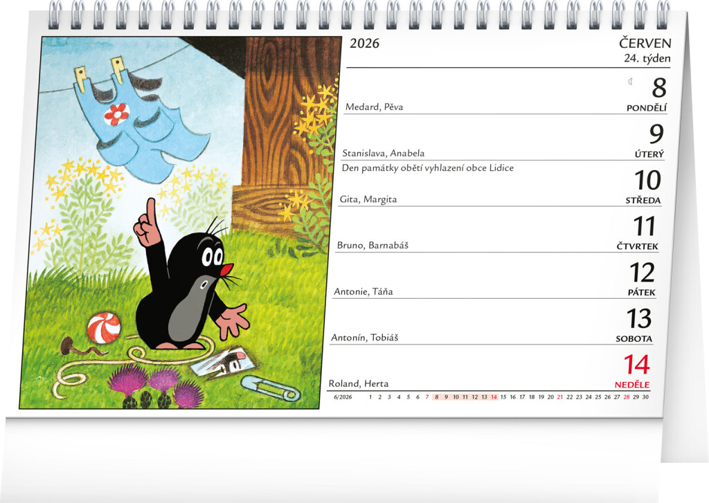 Krtkova dobrodružstvo si prial v detstve prežívať snáď každý z nás. Praktický stolný kalendár s ilustráciami Zdeňka Milera z obľúbených príbehov o Krtkovi obsahuje jeden obrázok na každý týždeň, kalendárium s českými menami, sviatkami a pamätnými dňami, fázami mesiaca a prehľad na rok 2026 a 2027.