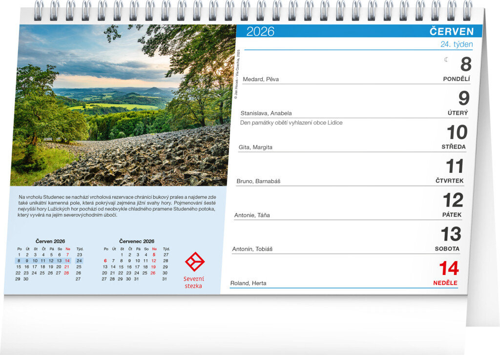 Trasy chodníkov Via Czechia (Severná, Južná, Stredozemie, Centrálna, Sliezsko a Českomoravská) prechádzajú celou Českou republikou po hraniciach i stredozemím, sledujú prevažne štátne hranice a prekračujú najvyššie vrcholy väčšiny našich hôr. Trasy vedú v čo najväčšej miere prírodou a smerujú k mnohým zajímavostiam jednotlivých oblastí. Texty i fotografie dodal Jan Hocek. Stolný kalendár obsahuje okrem fotografií a textov slovenské kalendárium s menami, sviatkami a pamätnými dňami.