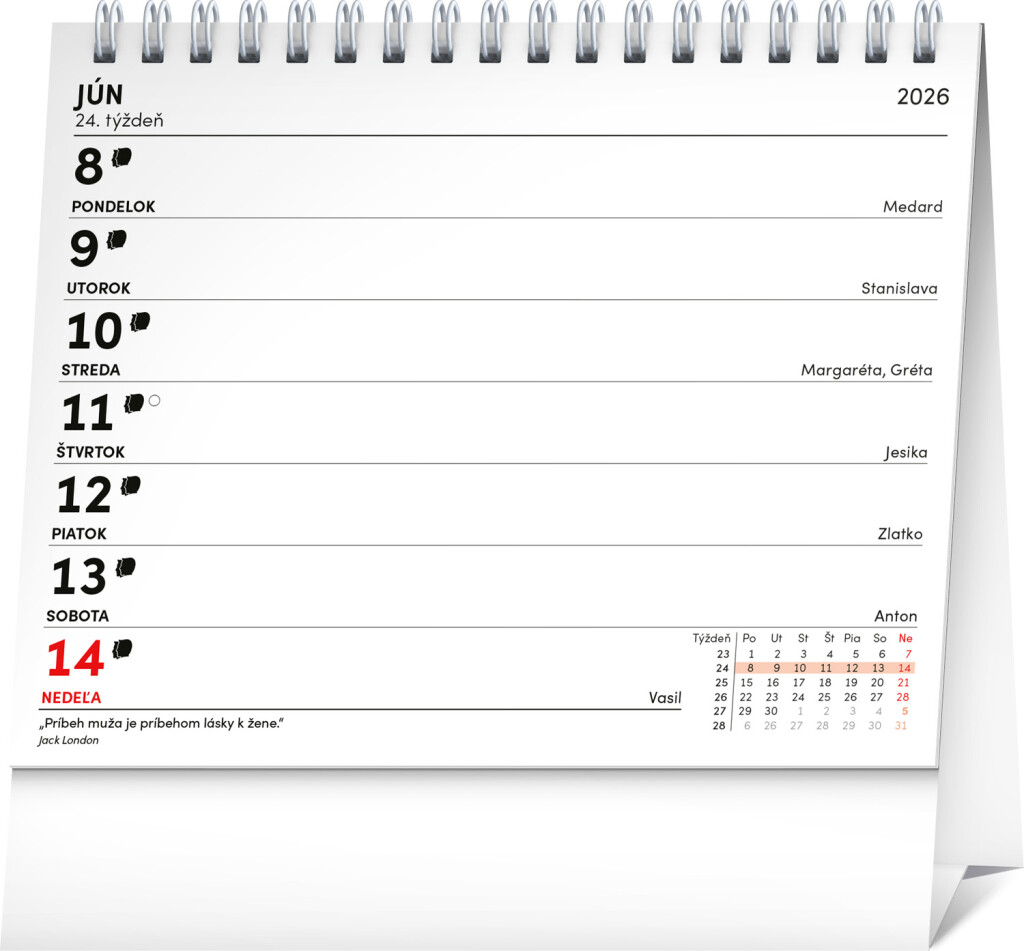 Plánovací stolný kalendár v malom formáte obsahuje prehľadné týždenné bezobrázkové kalendárium s dostatočným priestorom pre vaše poznámky. Ďalej v ňom nájdete citáty na každý týždeň, znamenia zverokruhu, slovenské mená, sviatky a pamätné dni. Citáty vás nabijú energiou, povzbudia či inšpirujú.